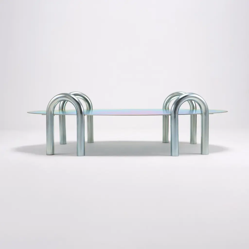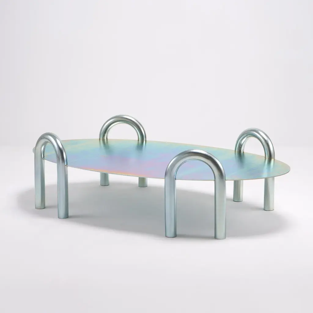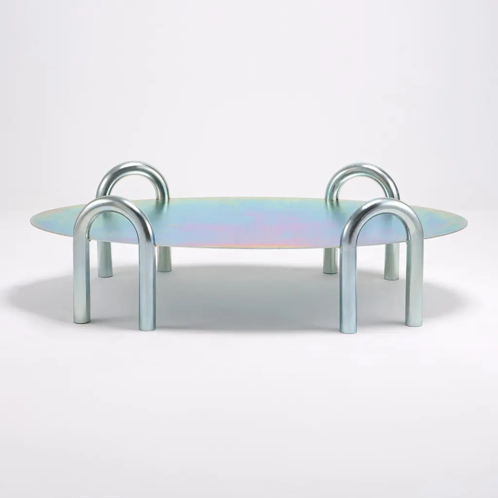 A common item in steel houses, the 180º curve is the starting point for the development of the collection. Using this element of industrial origin and organic format, we seek to create affable pieces, which transmit softness incorporated into the rawness of the material. In this version, we further reinforce its origin traces through white and yellow zinc plating, bringing to light this very common finish in the industry, but little appreciated outside of it.