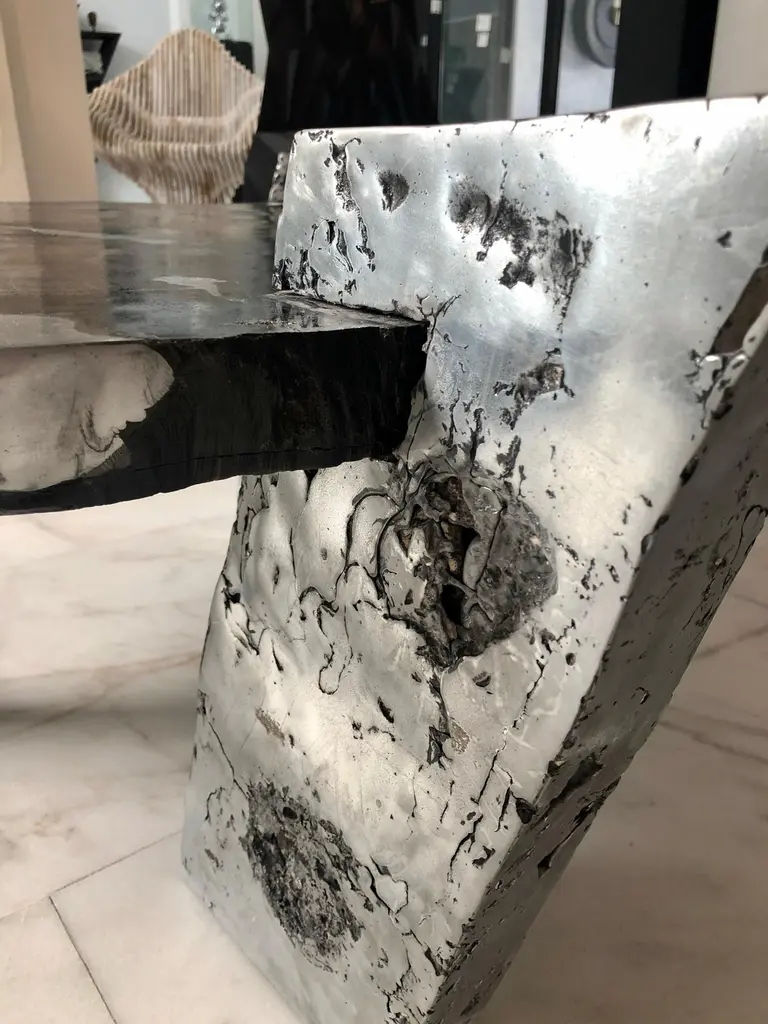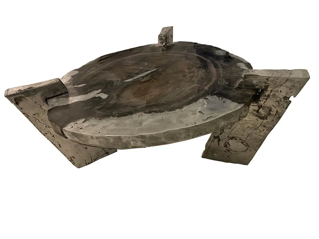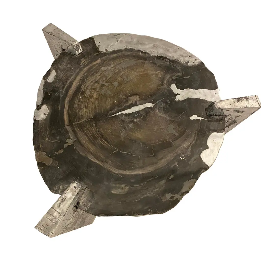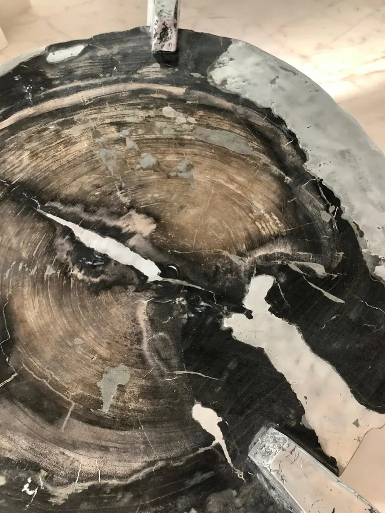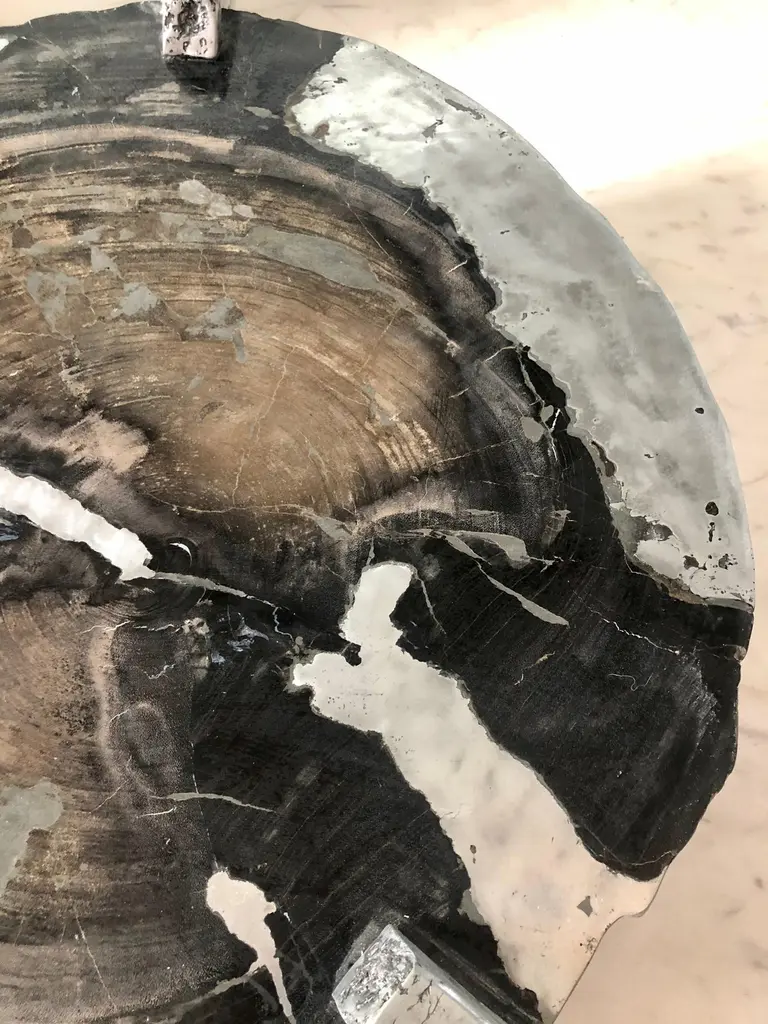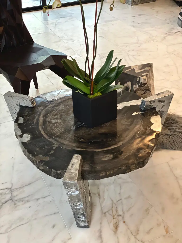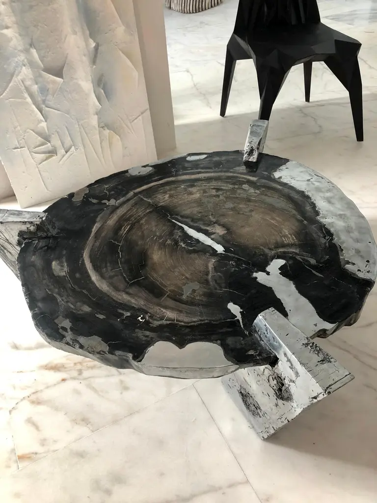 A keen proponent of sustainability, Brevard’s handcrafted sculptural furniture aims to celebrate ancient materials natural to our earth. This circular coffee table is part of the decay of time series, a collection of zinc and petrified wood furniture. This collection features imprints of coral that had washed ashore due to the acidification of our oceans burned into the cast zinc.About the materials:Zinc: Zinc is essential for the environment. Zinc is a natural element and plays an essential role in the biological processes of all humans, animals and plants. Zinc is an essential micronutrient for human health. Zinc can be recycled infinitely without loss of properties and quality. In addition to being sustainable during use, zinc also plays an important role during the end-of-life phase by reducing energy use, lowering emissions and minimizing waste disposal. In Brevard’s pieces, zinc provides high structural integrity and outstanding corrosion resistance. A thin layer of resin is applied to the table to seal the zinc and enhance comfort on skin.Petrified Wood: Harder to cut than steel, the petrified wood used in Brevard’s works have solidified from trees into stone over hundreds of millions of years. All pieces are extracted in a sustainable manner with the utmost care. Brevard and his team search for the tips of these petrified trees emerging slightly from the ground in Indonesian rainforests. Using a skilled team of excavators, they carefully dig around each piece to slowly remove them. The pieces are not extracted with heavy machinery nor any forest damaging equipment. Extractions generally take 4 to 8 weeks and several labor crews of over 15 people involved. Once the material reaches the warehouse, the designer spends weeks to cut and polish one piece. Petrified wood can only be cut with diamond saws and diamond polishing pads because of the density of the material. It takes more than a full day to cut one small slab of petrified wood, not to mention the additional months it takes to create just one piece of functional sculpture. Each piece of petrified wood used in Brevard’s creations has a unique color, pattern, and grain. Due to the provenance, the color tones tend to range between white and dark brown/black. Therefore, each piece is truly unique. About John Brevard:John Brevard is a luxury lifestyle brand founded by American architect and designer John Brevard in 2007. The design ethos of John Brevard is the merging of past, present, and future in an ethereal way, through materials, textures, and fractal patterns that exist at all scales in the universe. Inspired by the principles of natural order, each creation is symbolic of the inseparable relationship of the part to the whole. The brand currently features fine jewelry, furniture, sculpture, and art. Creative Director Brevard is a member of the Council of Fashion Designers of America (CFDA). In addition, Brevard is currently the architect, Creative Director, and co-developer for a Six Senses hotel slated to open in Iceland in 2022.