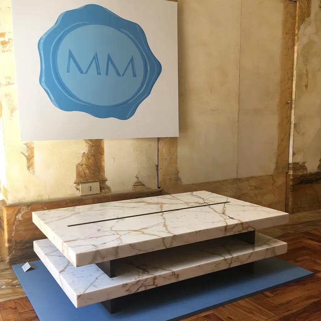 This luminous and statement-making coffee table is an exercise in orthogonal plans and impeccably balanced, sculpted volumes. Crossing panels in burnished brass create the solid structure to which are juxtaposed 2cm-thick tops, which are comprised of an inner honeycomb frame enveloped by thin layers of prized Calacatta Oro marble kept steadily in place with epoxy resin. Featuring a golden groove along the upper top, this unexpectedly lightweight design pairs formal rigor and luxe details. Please note that marbles and stones are natural materials and they can differ also if coming from the same quarry or the same block. The product shown may differ from purchased items. Every piece is unique.