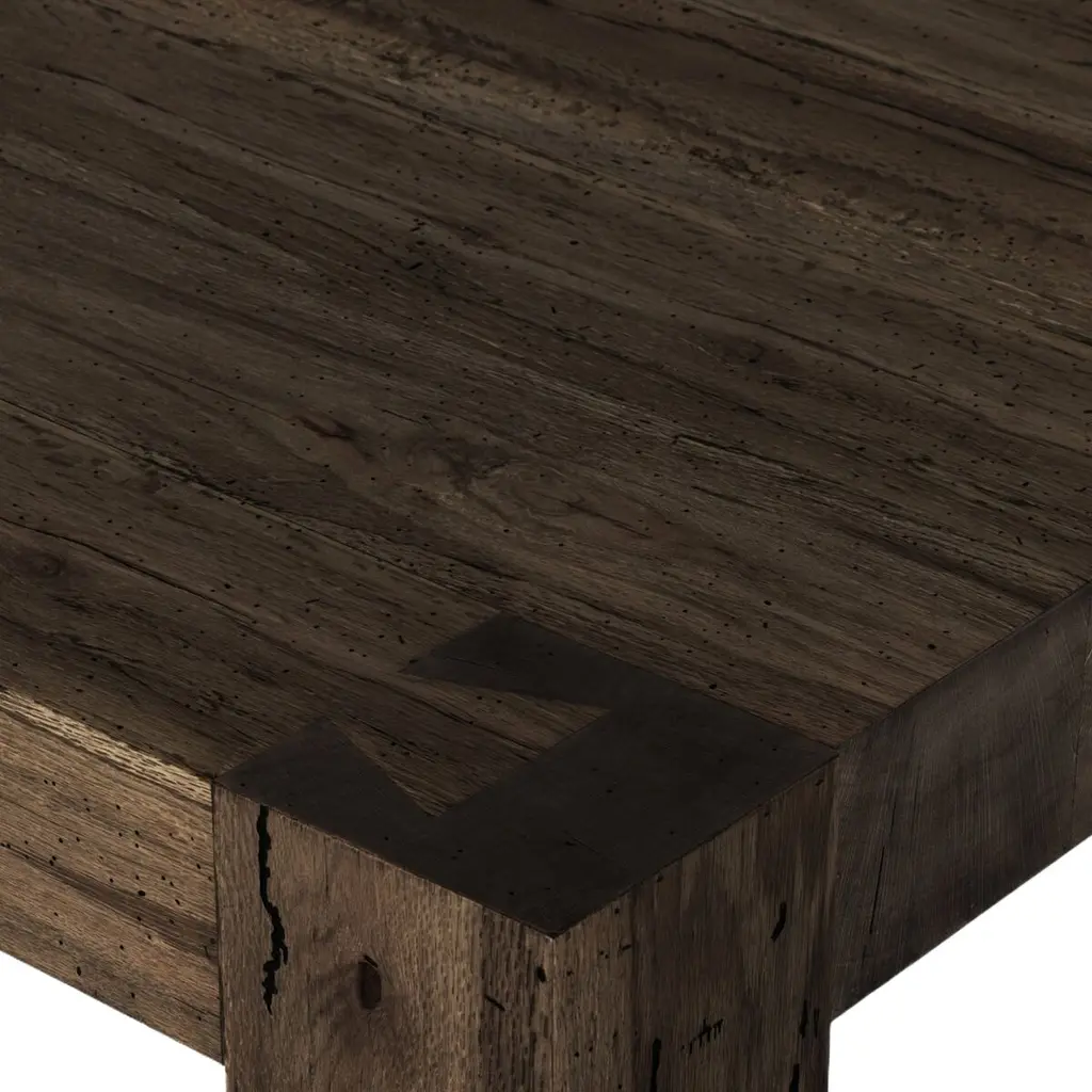 The Zuri Coffee Table is a stunning centerpiece for any living space. Crafted from thick-cut oak veneer, it boasts a faux rustic finish that beautifully emulates the timeless charm of wormwood oak. This low, large-scale coffee table is designed with chunky squared legs and features exquisite dovetail joinery detailing, making it both a functional and stylish addition to your home.