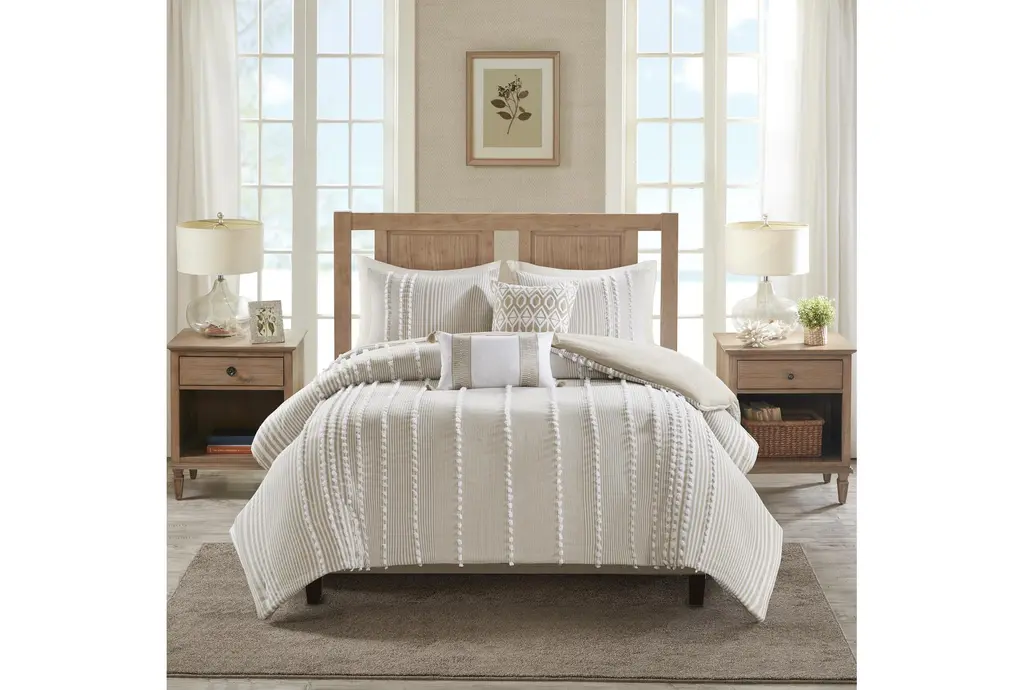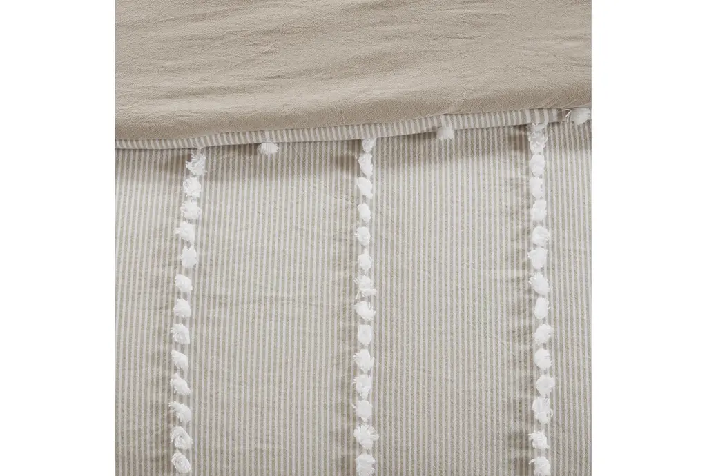 Eastern King Comforter-3 Piece Set Cotton Pom Pom Beige Rectangle | Comforters