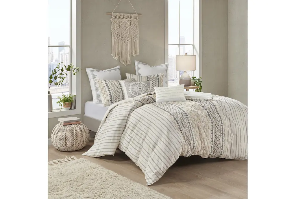 Transform your bedroom into a boho chic sanctuary with the Full/Queen Comforter-3 Piece Set. This contemporary comforter set features a geometric design in a soft cream cotton that adds a touch of modern farmhouse charm to your space. Perfectly sized for full or queen beds, the breathable fabric ensures a comfortable night's sleep.