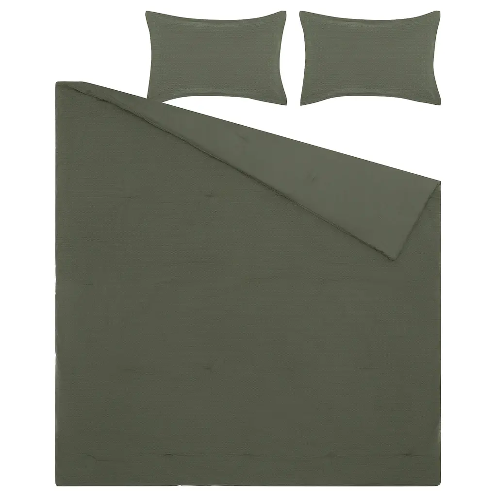 LUKTVICKER Comforter set - green King. The waffle structure on the topside of the comforter creates a 3D-effect that gives the comforter a beautiful texture. 100% cotton fabric that breathes and feels wonderfully soft against your skin. Pillow sham with a closure in the middle of the back.