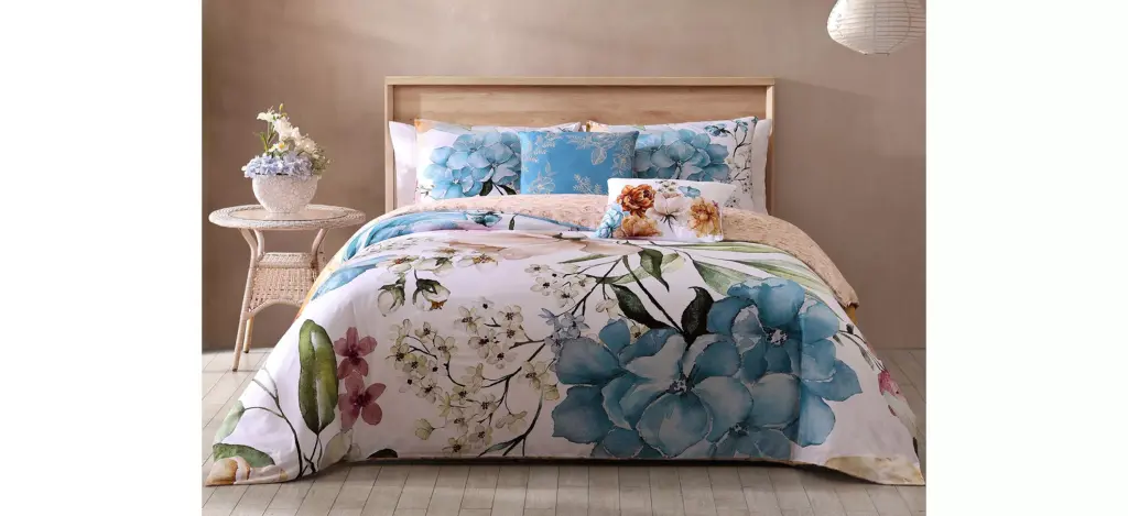 Maia 5-piece reversible comforter set. On top of a white ground, blue, blush, pink and terracotta flowers look fresh on a high quality 230 thread count 100% cotton sateen. The reverse side picks up the terracotta color with dozens and dozens of subtle roses for two very versatile looks. The set includes 1 reversible comforter, 2 zipper shams and 2 decorative pillows. One pillow is embroidered, while the other is printed.