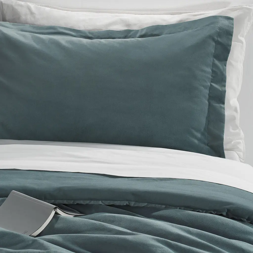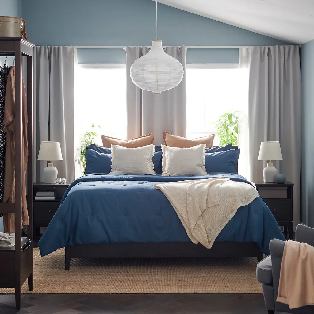 PIGGTISTEL Comforter set - dark blue King. Cotton/linen blend; combines the shine and firmness of linen with the softness of cotton. The comforter’s fluffy filling gives your bed an inviting expression and offers a warm embrace, night after night. Easy-care since the comforter can be machine washed.
