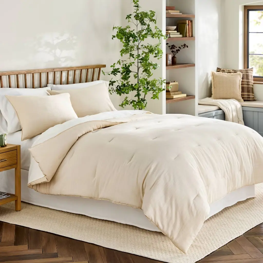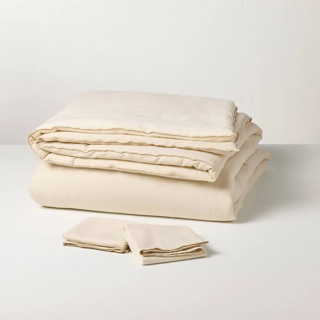 Give your sleeping nook an elegant upgrade with this 3-Piece Comforter Set from Hearth & Hand™ with Magnolia. This multi-piece bedding set is made from a midweight fabric blend of lyocell, cotton and linen with lyocell-cotton blend backing for comfortable use. It includes a comforter and two standard pillow shams, all featuring a tan color and 104 thread count. The comforter has soft filling to keep you in luxurious comfort, and a convenient European-style envelope closure on the shams allows for easy pillow insertion and removal.Hearth & Hand™ with Magnolia: Gather • Create • Enjoy