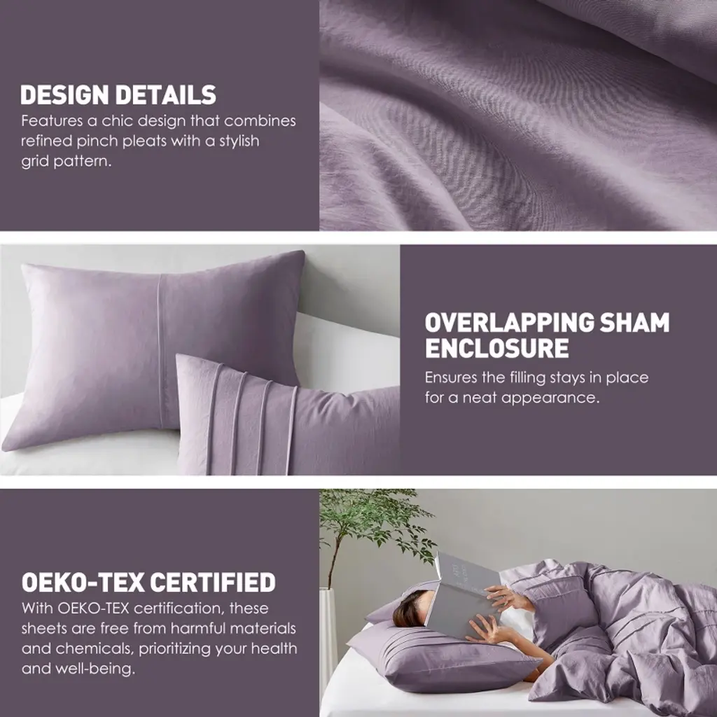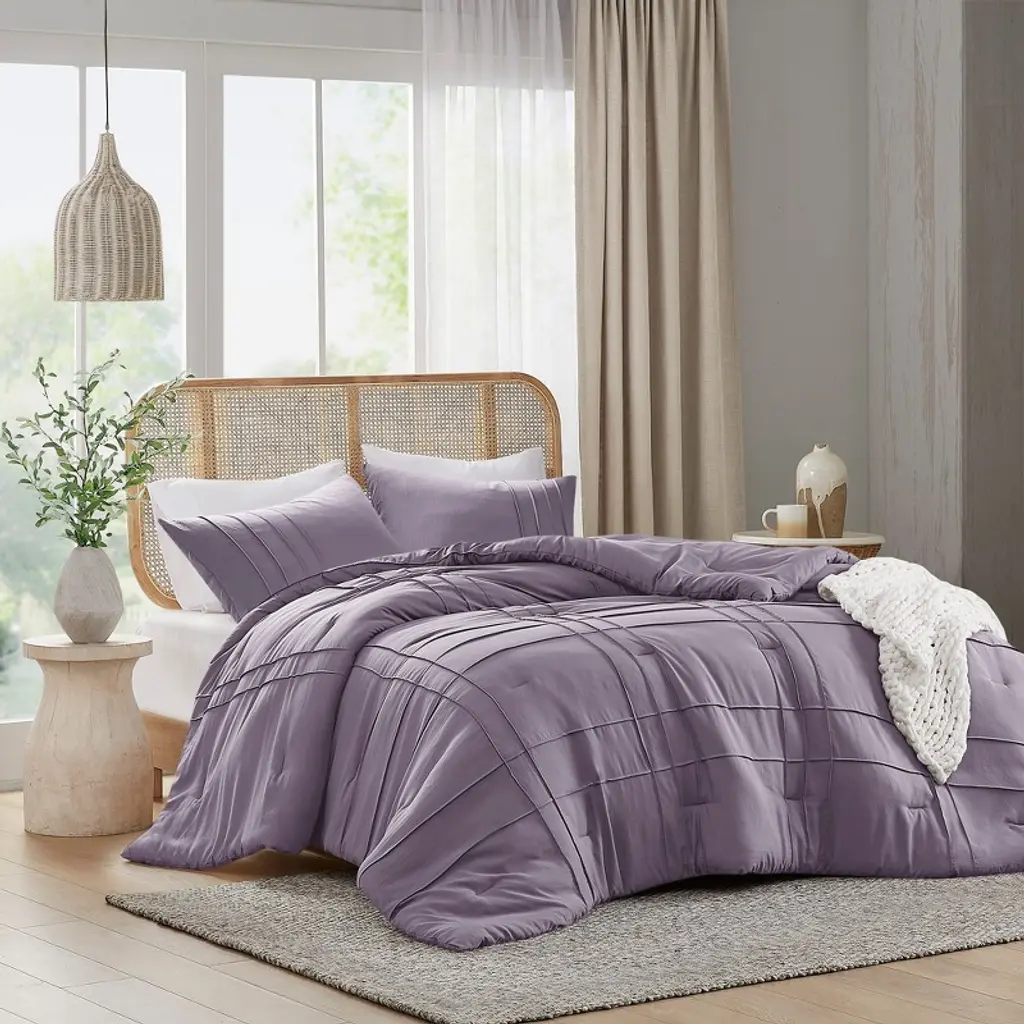 This stylish pinch pleat comforter, accented with a modern grid pattern, offers the perfect mix of plush loft and lightweight comfort. Filled with premium polyester, it delivers cozy warmth in cooler months and breathable comfort during warmer seasons, making it ideal for year-round use. The pre-washed microfiber fabric is specially treated for enhanced softness, pairing a clean look with subtle texture to complement any bedroom style. Crafted from high-quality microfiber and featuring our advanced dyeing process, this durable comforter set is machine washable for long-lasting beauty and everyday convenience. The pre-washed microfiber has been treated for added softness and features a clean but textured design suitable for any bedroom. Made from premium microfiber and housing our innovative dyeing technique, this comforter set can also be machine washed and is extra durable for long lasting comfort.