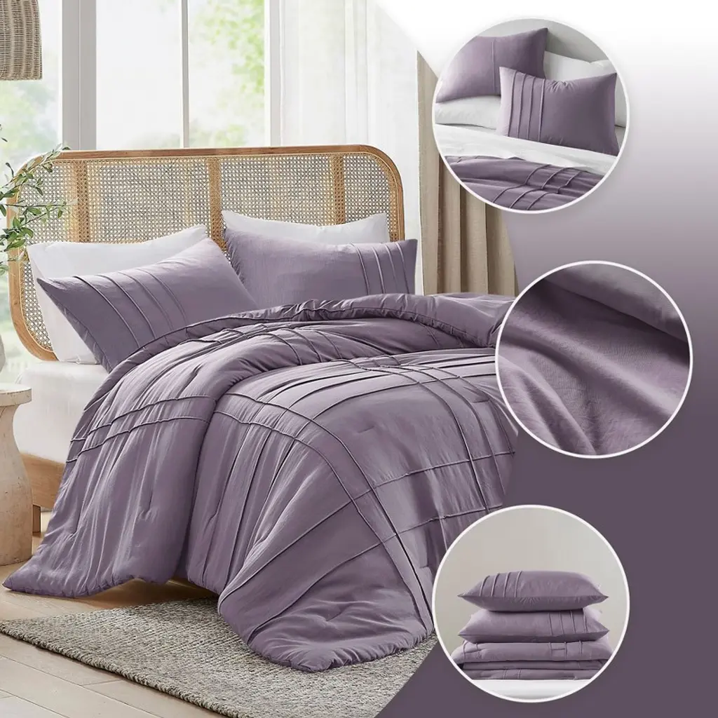 3Pcs Comforter Set Pinch Pleat Comforter For All Seasons Stylish Grid Pattern Bedding Set, Lightweight Solid Bed Comforter Sets, Purple, King