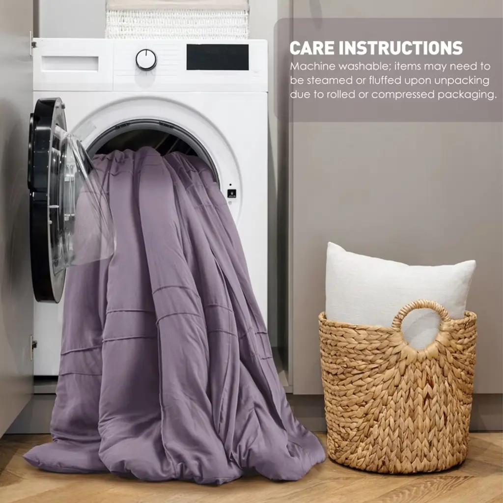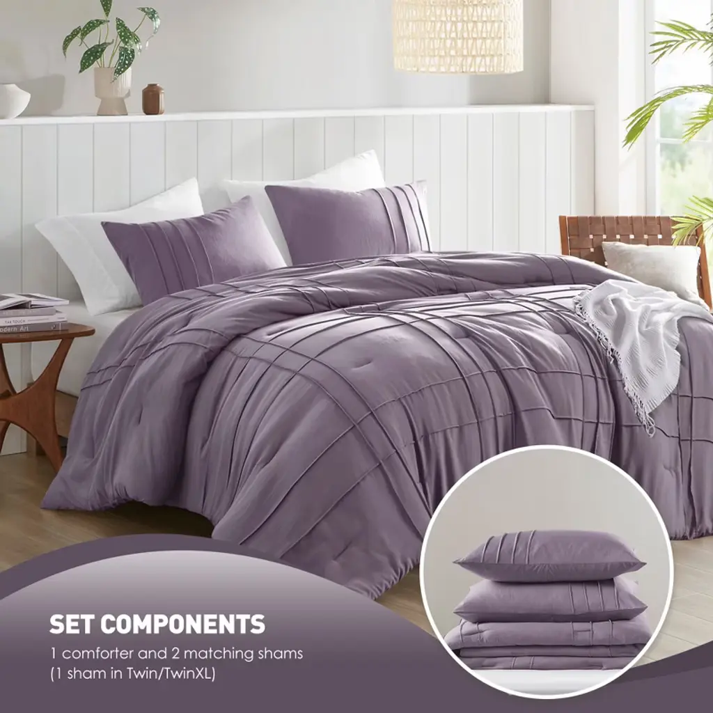 This stylish pinch pleat comforter, accented with a modern grid pattern, offers the perfect mix of plush loft and lightweight comfort. Filled with premium polyester, it delivers cozy warmth in cooler months and breathable comfort during warmer seasons, making it ideal for year-round use. The pre-washed microfiber fabric is specially treated for enhanced softness, pairing a clean look with subtle texture to complement any bedroom style. Crafted from high-quality microfiber and featuring our advanced dyeing process, this durable comforter set is machine washable for long-lasting beauty and everyday convenience. The pre-washed microfiber has been treated for added softness and features a clean but textured design suitable for any bedroom. Made from premium microfiber and housing our innovative dyeing technique, this comforter set can also be machine washed and is extra durable for long lasting comfort.