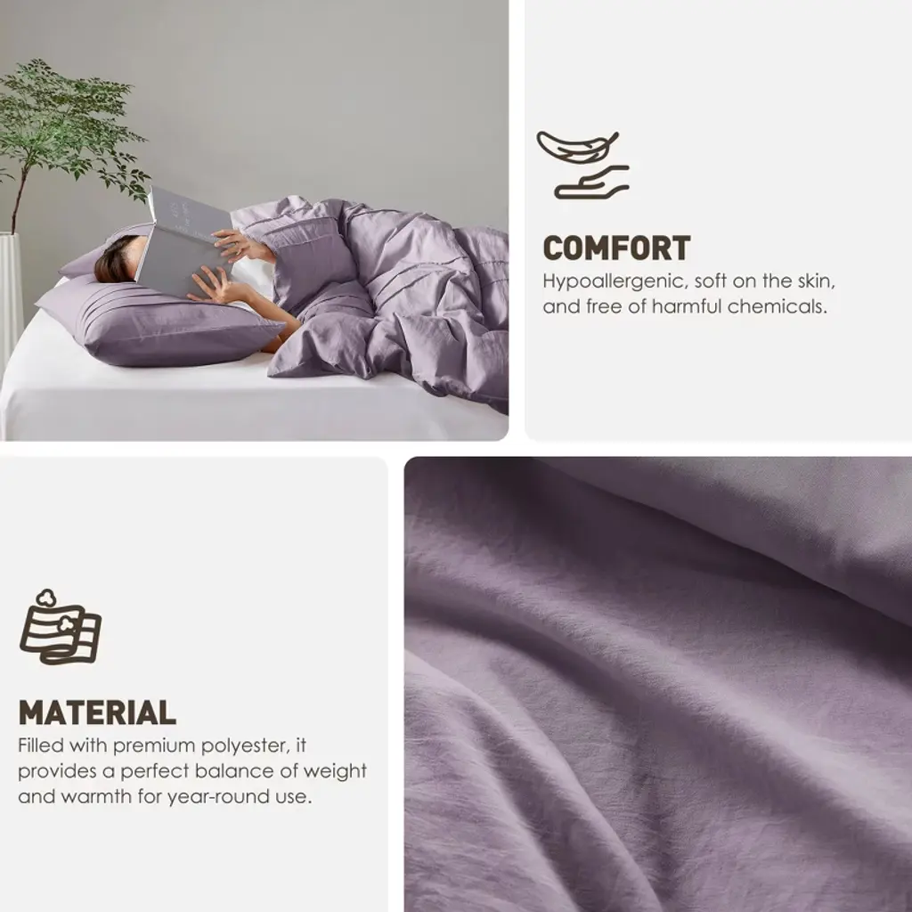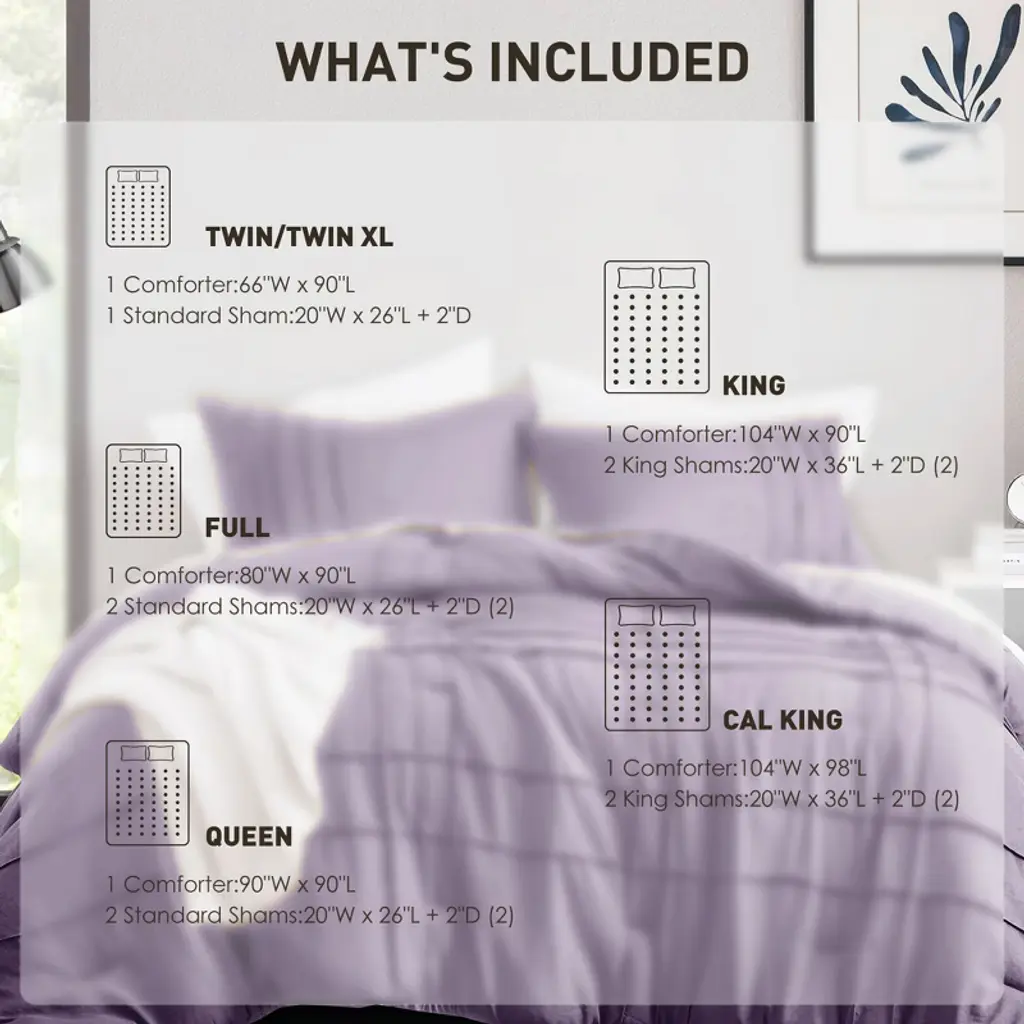 This stylish pinch pleat comforter, accented with a modern grid pattern, offers the perfect mix of plush loft and lightweight comfort. Filled with premium polyester, it delivers cozy warmth in cooler months and breathable comfort during warmer seasons, making it ideal for year-round use. The pre-washed microfiber fabric is specially treated for enhanced softness, pairing a clean look with subtle texture to complement any bedroom style. Crafted from high-quality microfiber and featuring our advanced dyeing process, this durable comforter set is machine washable for long-lasting beauty and everyday convenience. The pre-washed microfiber has been treated for added softness and features a clean but textured design suitable for any bedroom. Made from premium microfiber and housing our innovative dyeing technique, this comforter set can also be machine washed and is extra durable for long lasting comfort.