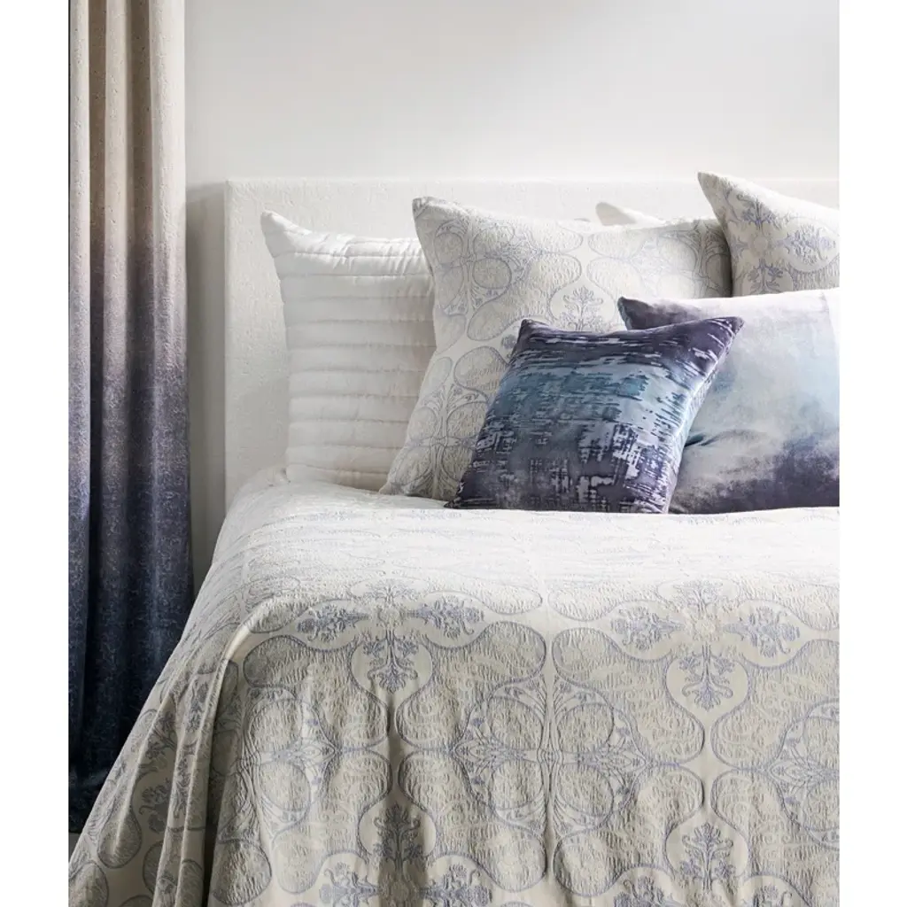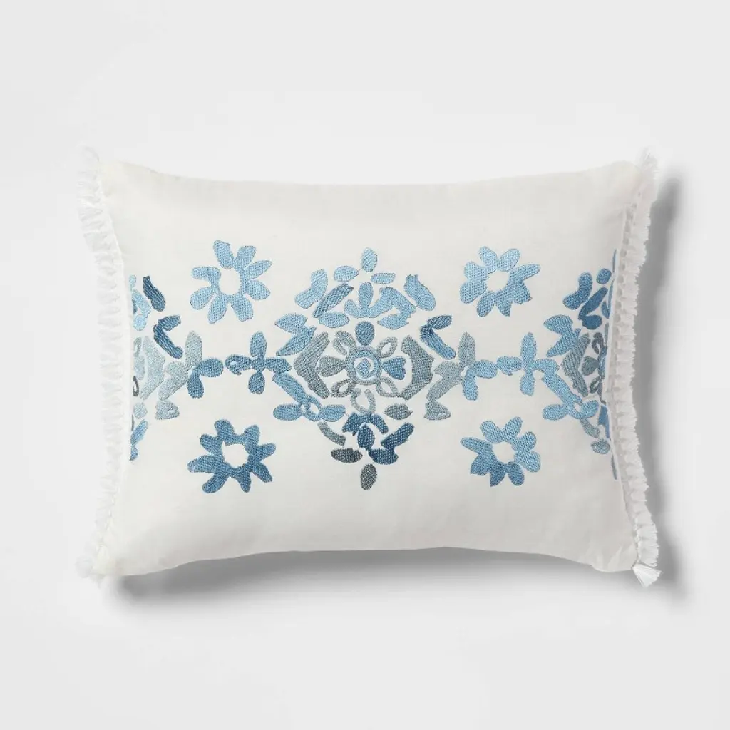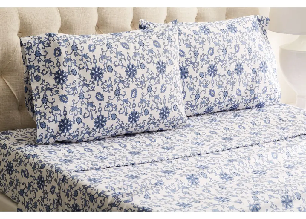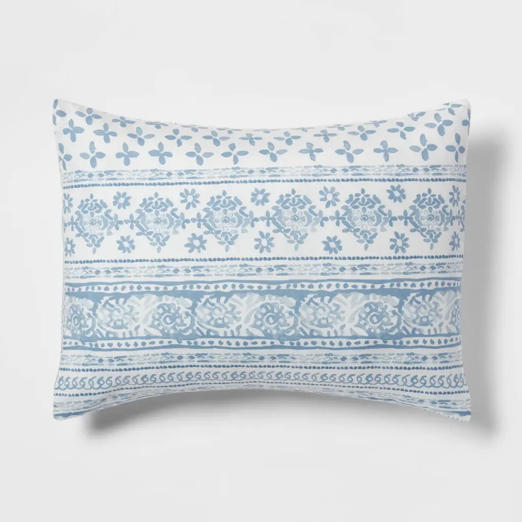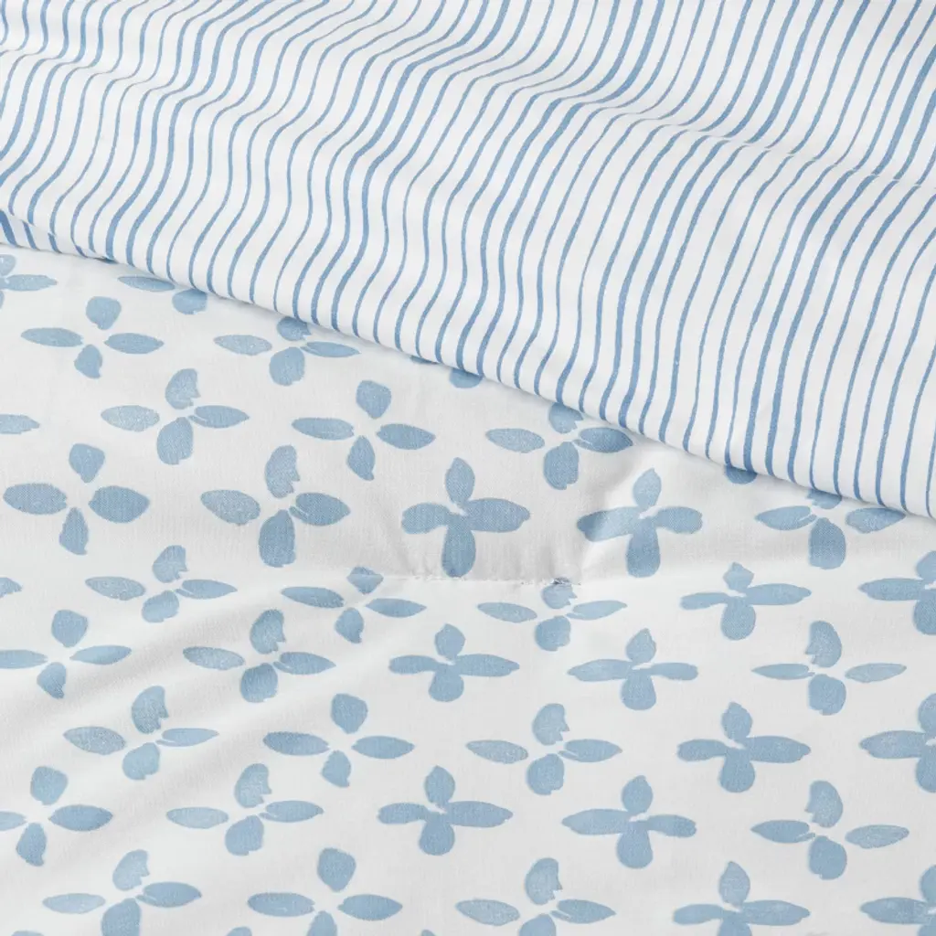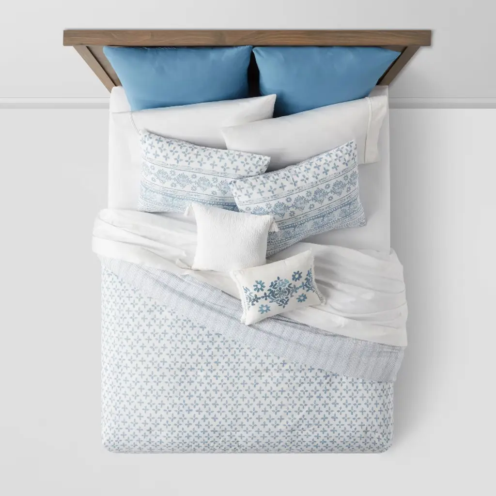 Create a serene sleeping nook with the Sorrento Block-Print Comforter Bedding Set from Threshold™. The eight-piece bedding set includes a comforter adorned with a floral block print in light blue on a white background for a refreshing look. It comes with pillow shams, Euro shams, decorative pillows and a bedskirt for a complete look. For added convenience, the multi-piece comforter bedding set is crafted from cotton-polyester blend shell (polyester fill) that is machine washable.Threshold™: Quality & Design / Casual classics for house and home.