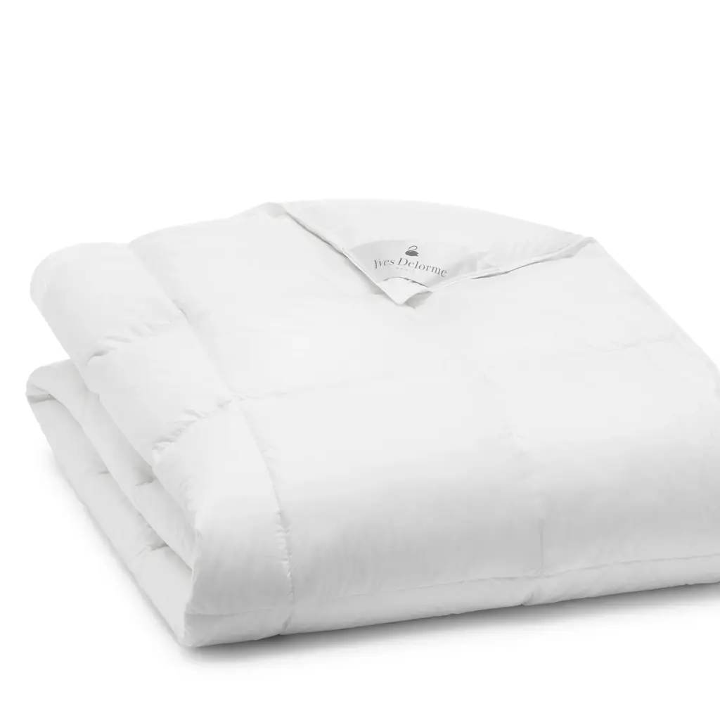 Yves Delorme used a batiste weave for continuous air circulation and light-yet-resilient European goose down--box-stitched in place for even distribution--to create this All Season comforter, delivering warmth without weight.