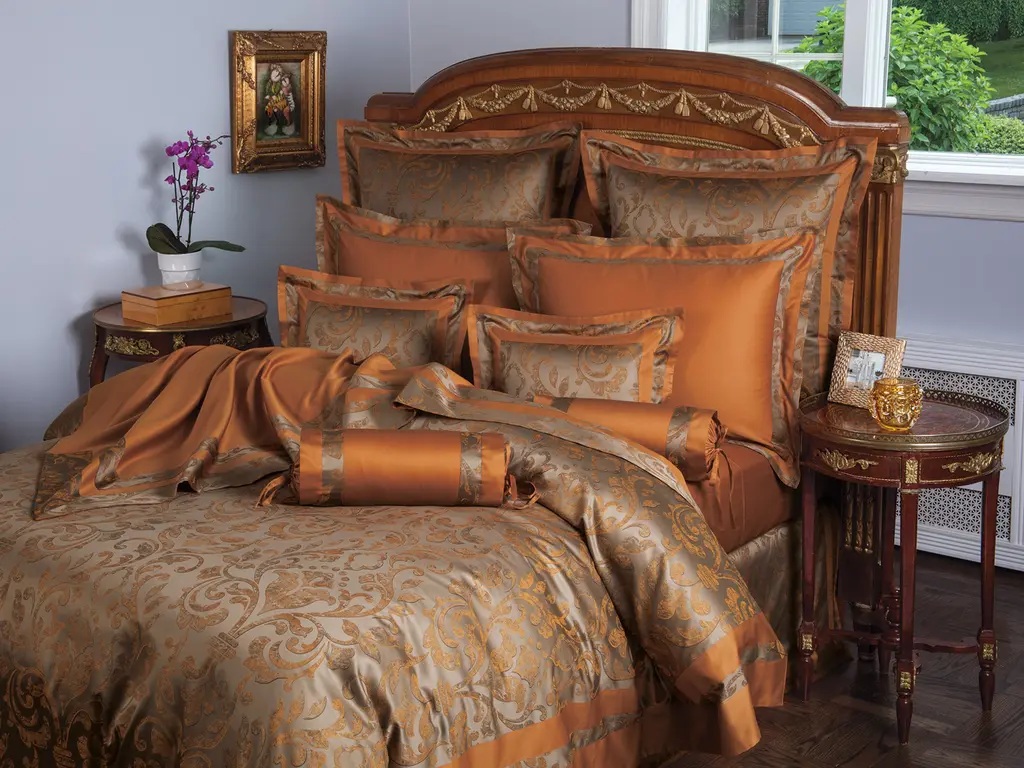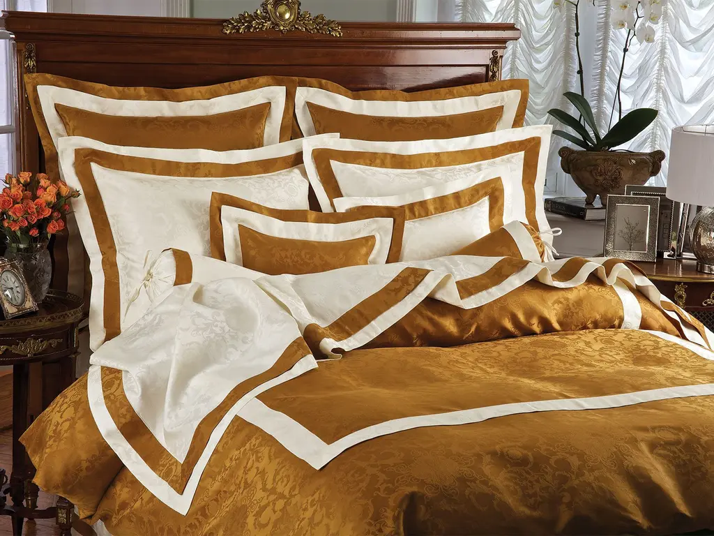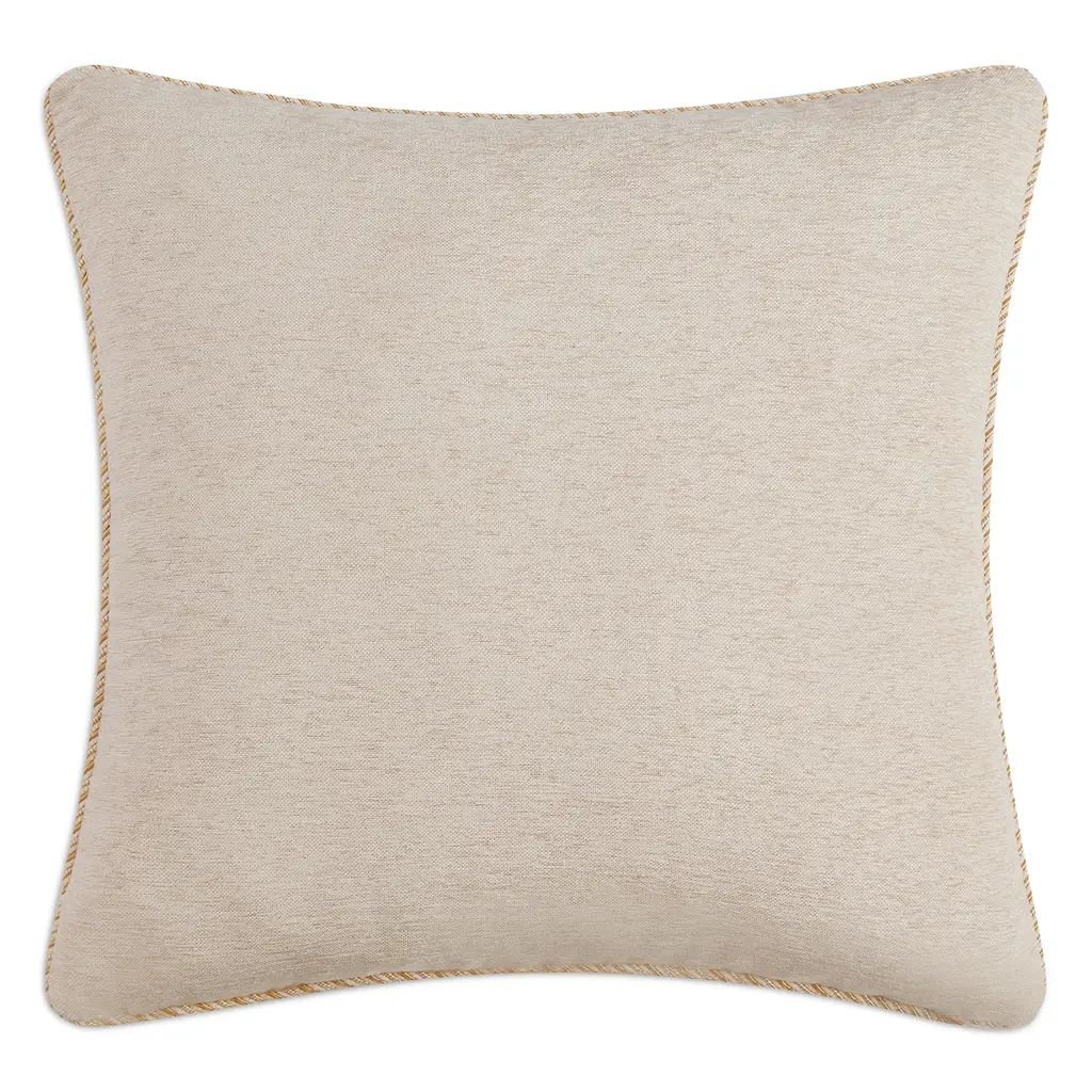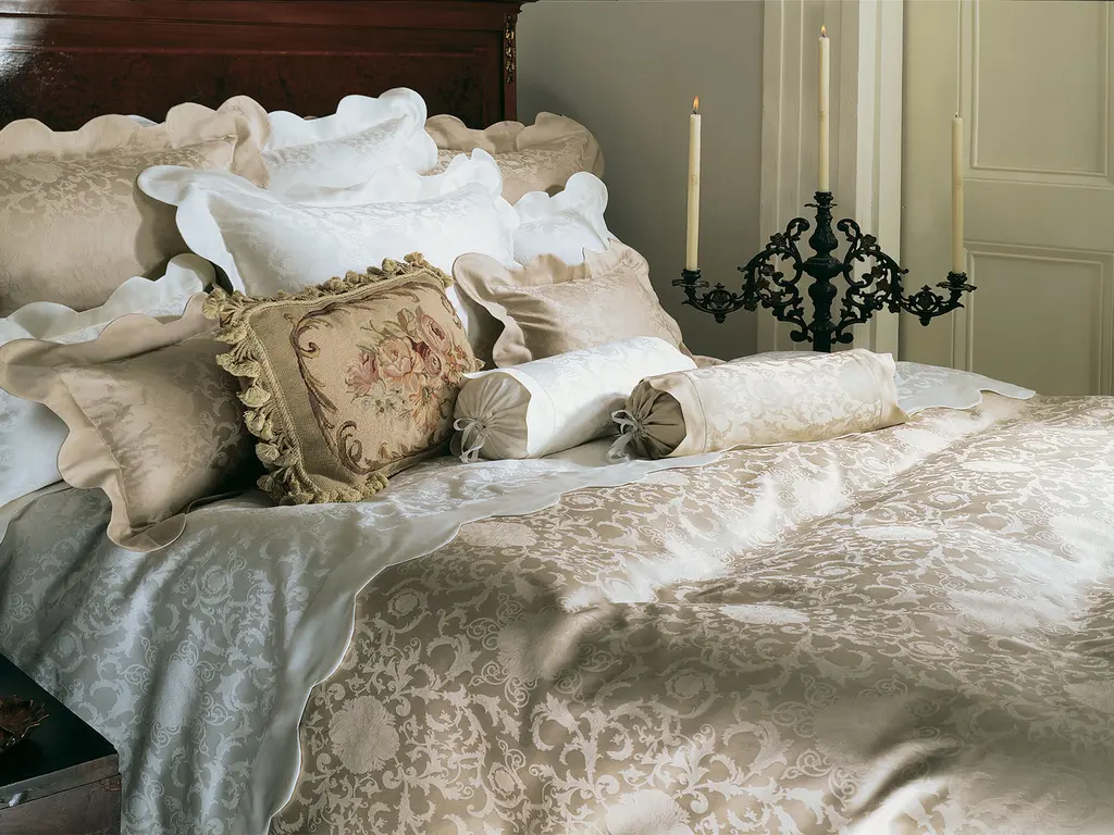 Classic and timeless, the Ansonia collection by Waterford Fine Linens showcases a gorgeous ivory and gold chenille floral jacquard design. The comforter and shams reverse to an ivory and gold scroll jacquard. The euro shams showcase a quilted velvet center surround by a luxurious gold velvet with a solid ivory chenille reverse. The light taupe box pleated bed skirt with cover button trims completes the look.