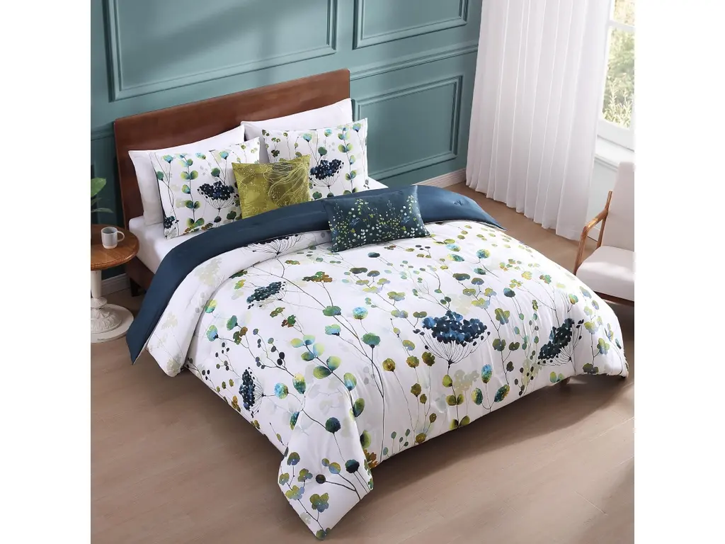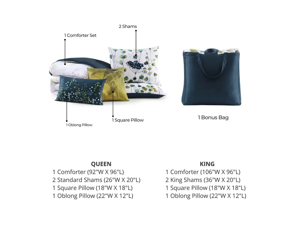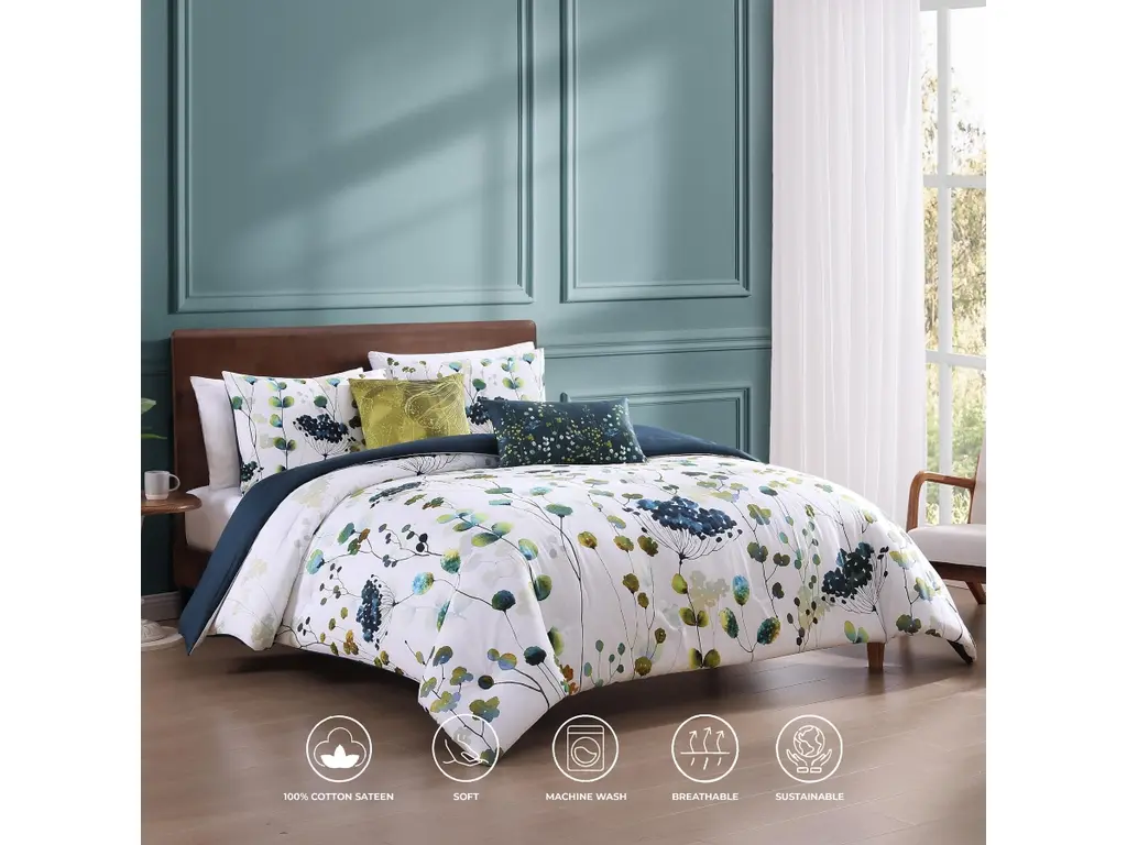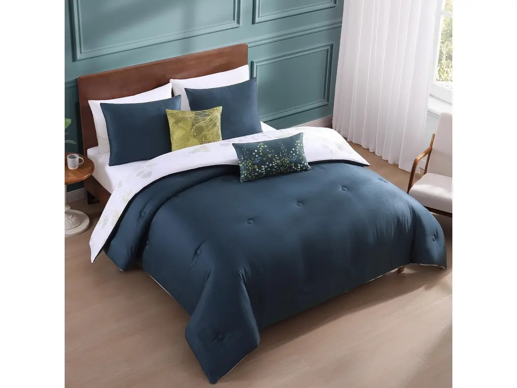 The Bebejan Abstract Vines 5 Piece Reversible Comforter Set has a crisp, contemporary flair with navy blue and gold vines sitting on a clean, white background. On the reverse, a printed navy blue tonal textured weave pattern complements the front and offers a completely different second look to your bedroom. Gold contrasts beautifully on the navy textured oblong printed pillow and a gold abstract print square pillow with chain stitch embroidery complete the look for added value and style. This 100% cotton sateen 5 piece set includes 2 shams, an 18" x 18" embroidered pillow, and a 22" x 12" printed pillow. As a bonus, the set is packaged in a reusable self-fabric tote. 200-399 thread count.
