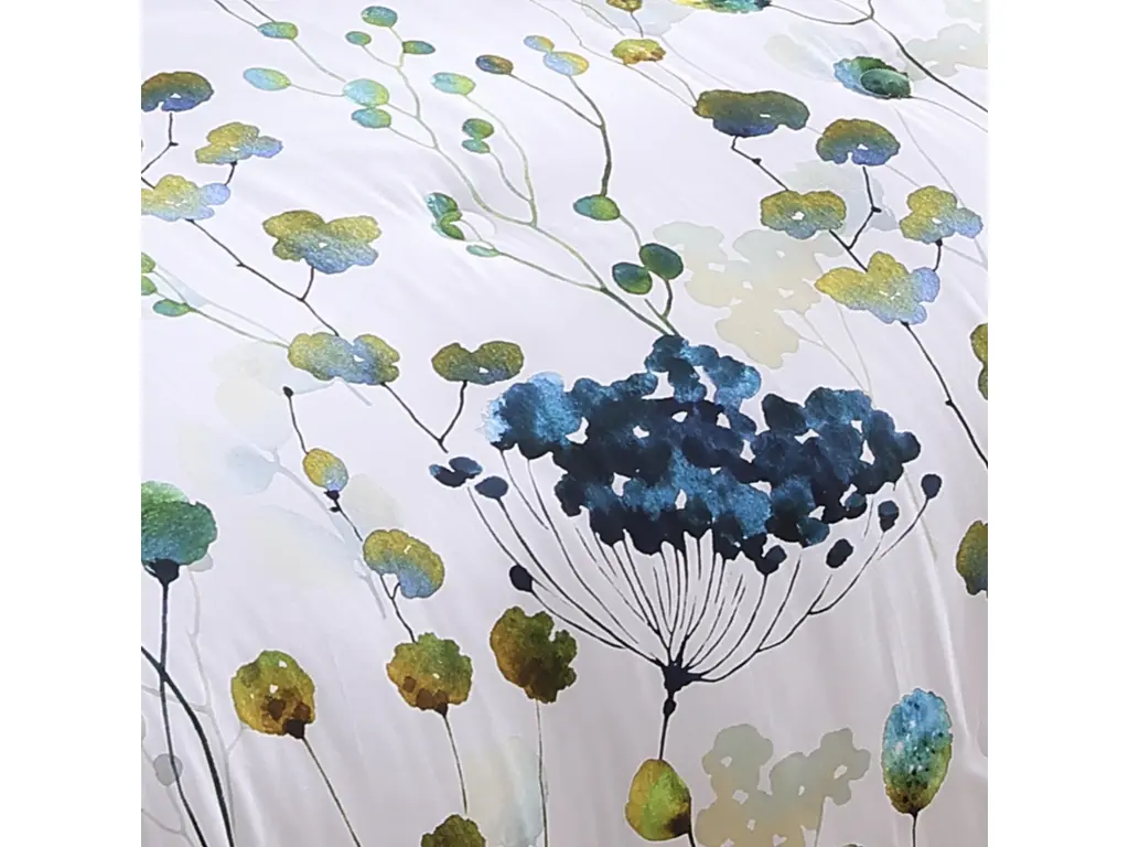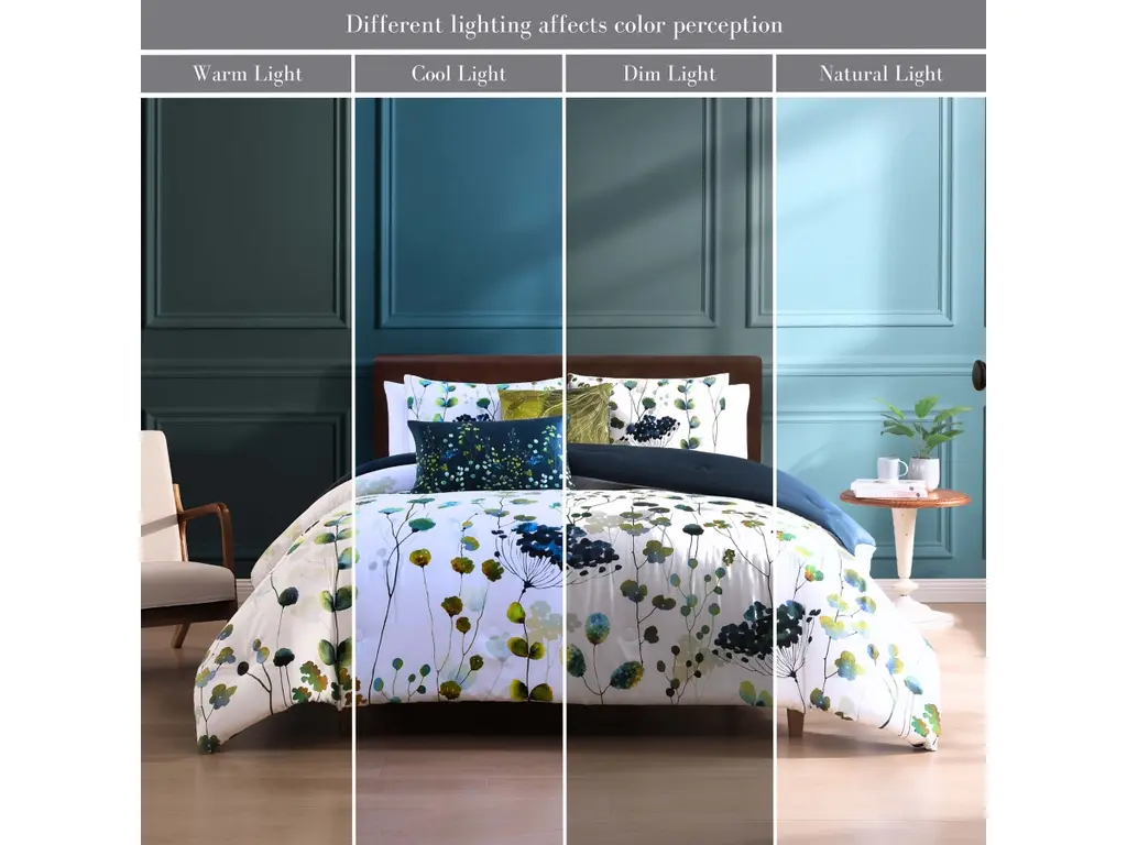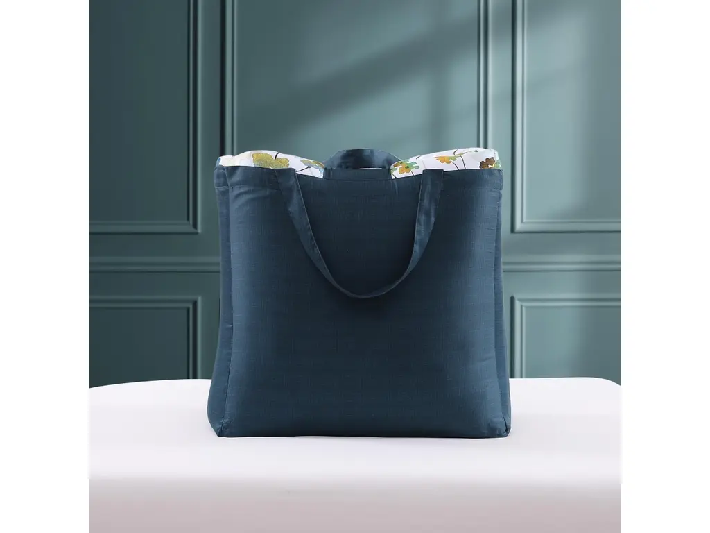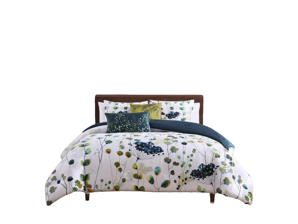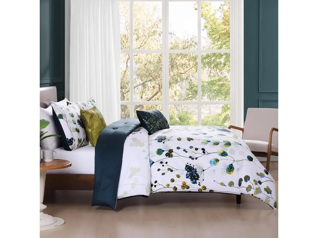 The Bebejan Abstract Vines 5 Piece Reversible Comforter Set has a crisp, contemporary flair with navy blue and gold vines sitting on a clean, white background. On the reverse, a printed navy blue tonal textured weave pattern complements the front and offers a completely different second look to your bedroom. Gold contrasts beautifully on the navy textured oblong printed pillow and a gold abstract print square pillow with chain stitch embroidery complete the look for added value and style. This 100% cotton sateen 5 piece set includes 2 shams, an 18" x 18" embroidered pillow, and a 22" x 12" printed pillow. As a bonus, the set is packaged in a reusable self-fabric tote. 200-399 thread count.