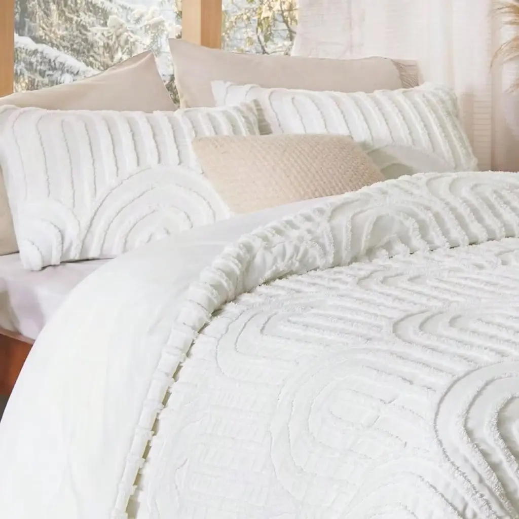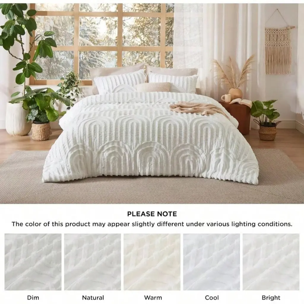 Boho Tufted Queen Comforter Set, White Farmhouse Bedding with Embroidery, Soft Cozy Arch Pattern for All Seasons