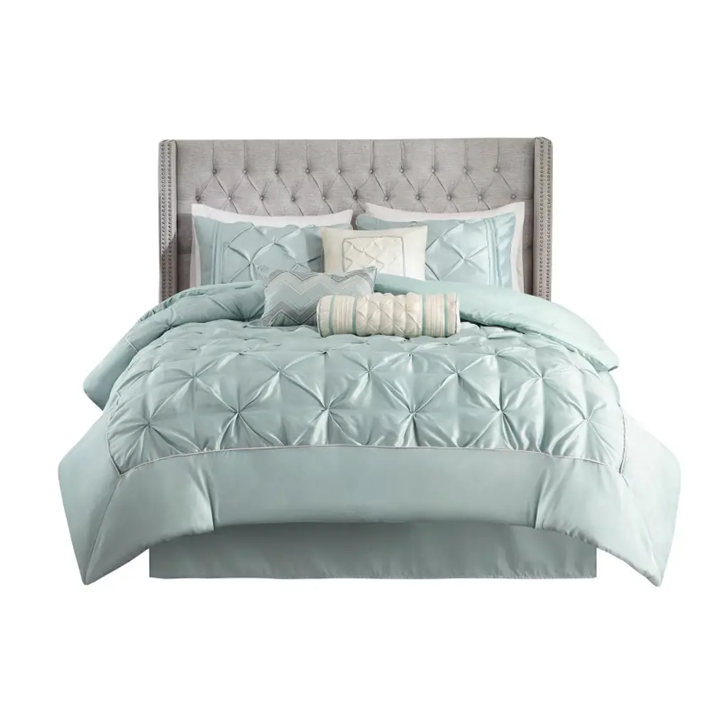 The collection is made from 100% polyester polyoni and has pieced fabric sewn together providing added dimension. It is finished with a smooth edge of fabric that creates a beautiful border around this comforter. Items in the set may come in a rolled or compressed packaging, which will need to be fluffed up or steam ironed before use to remove wrinkles.
