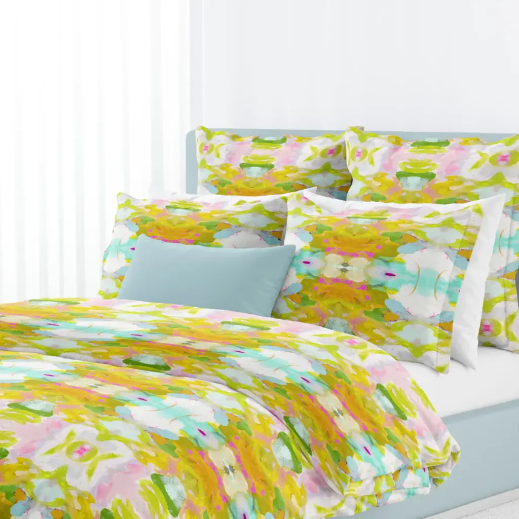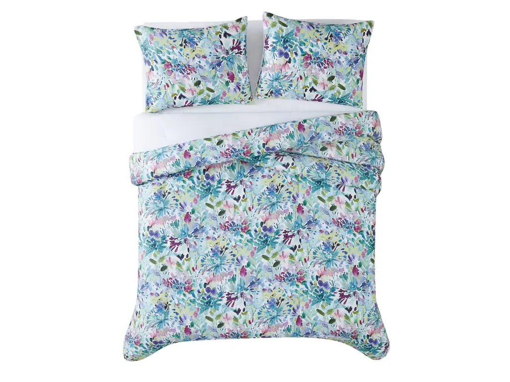 Wild, fun and bright mix floral pattern is a great pick me up for any room. This detailed digital print on 100% cotton, 200 thread count sateen fabric has a soft touch. The bright blue, green and pink shades bring light and color into a variety of room styles. The reverse is a 100% cotton solid white fabric that coordinates to the base of the print. Christian Siriano is all about color and print and this bed is a perfect example. Face and back is 100% cotton with 100% polyester fill. This item is machine washable, but please be sure to use appropriate sized machinery to avoid any excess wear on the items. This item is imported from Pakistan. Includes: one full/queen comforter 92 x 96 inches and two standard shams 20 x 26 inches.