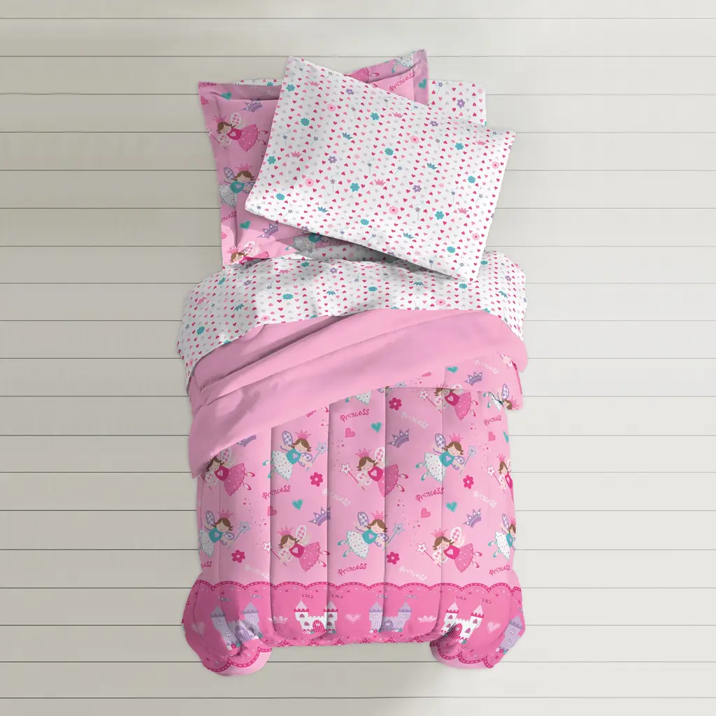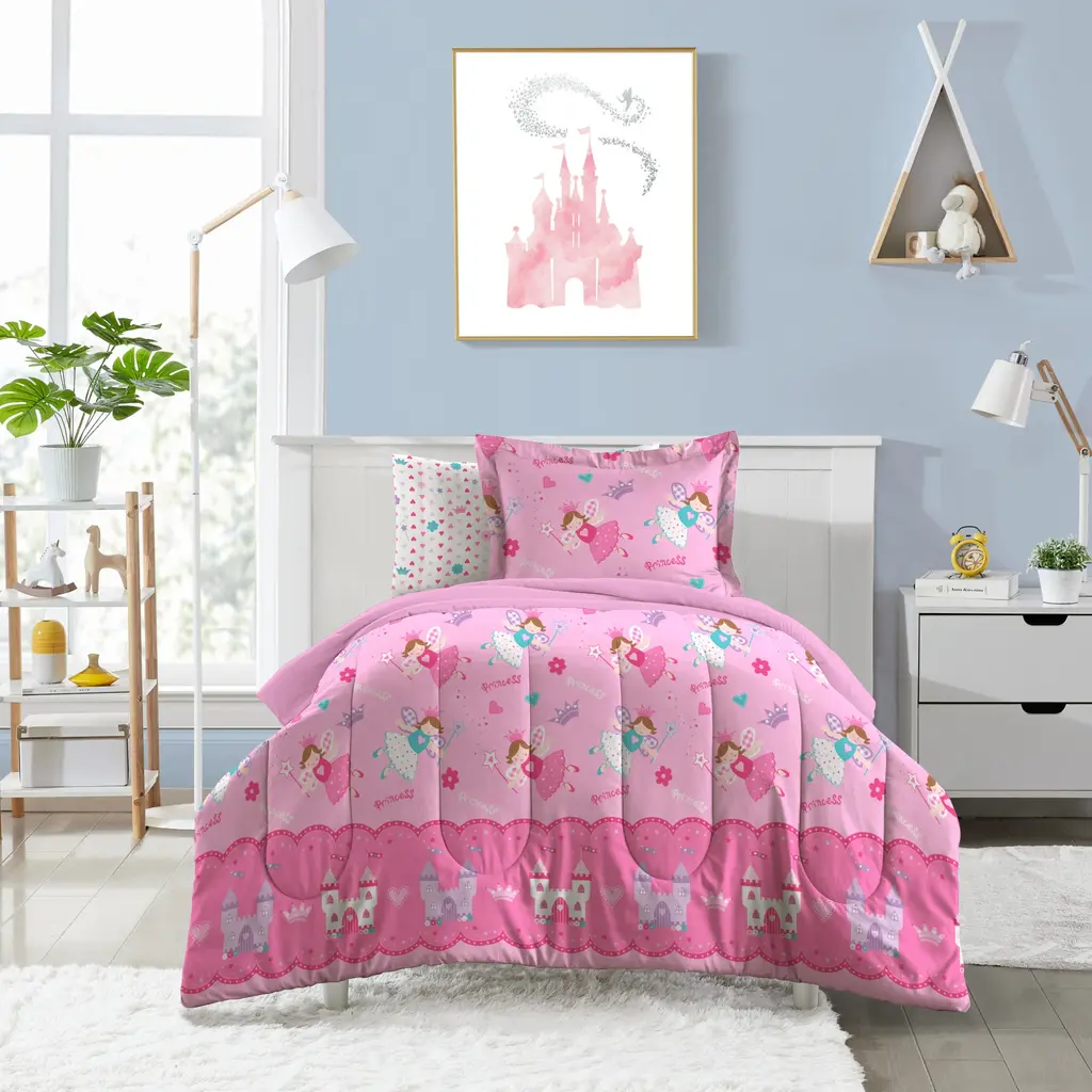 Easily set up a new room for your little one with this magical princess four-piece toddler bedding set. This princess bedding set features fairy princesses, castles, crowns, hearts and flowers in an array of multi-colors. The printed fabric comforter and sham reverse to a solid pink. The digital images we display have the most accurate color possible. However, due to differences in computer monitors, we cannot be responsible for variations in color between the actual product and your screen.