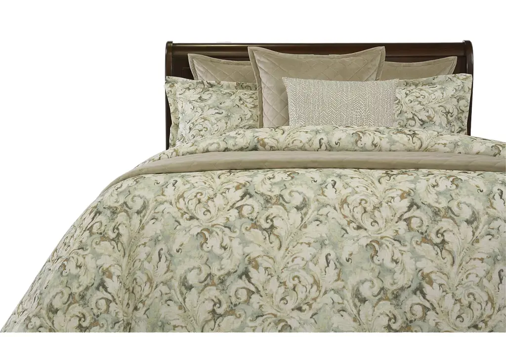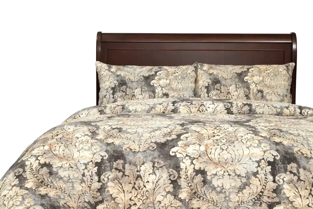 Like its namesake, our Elysian bedding set promises to bring you a blissful night's sleep. Featuring a damask motif over a powder blue background, this set is timeless in its beauty. The three-piece queen comforter set includes one queen-sized comforter and two standard shams. The three-piece king comforter set includes one king-sized comforter and two king shams. Fabric content for front: 70% Viscose, 30% Linen. Fabric content for back: 100% Cotton. Fill Content: 100% Polyester. Care instructions: Machine wash cold on gentle cycle then tumble dry on low.