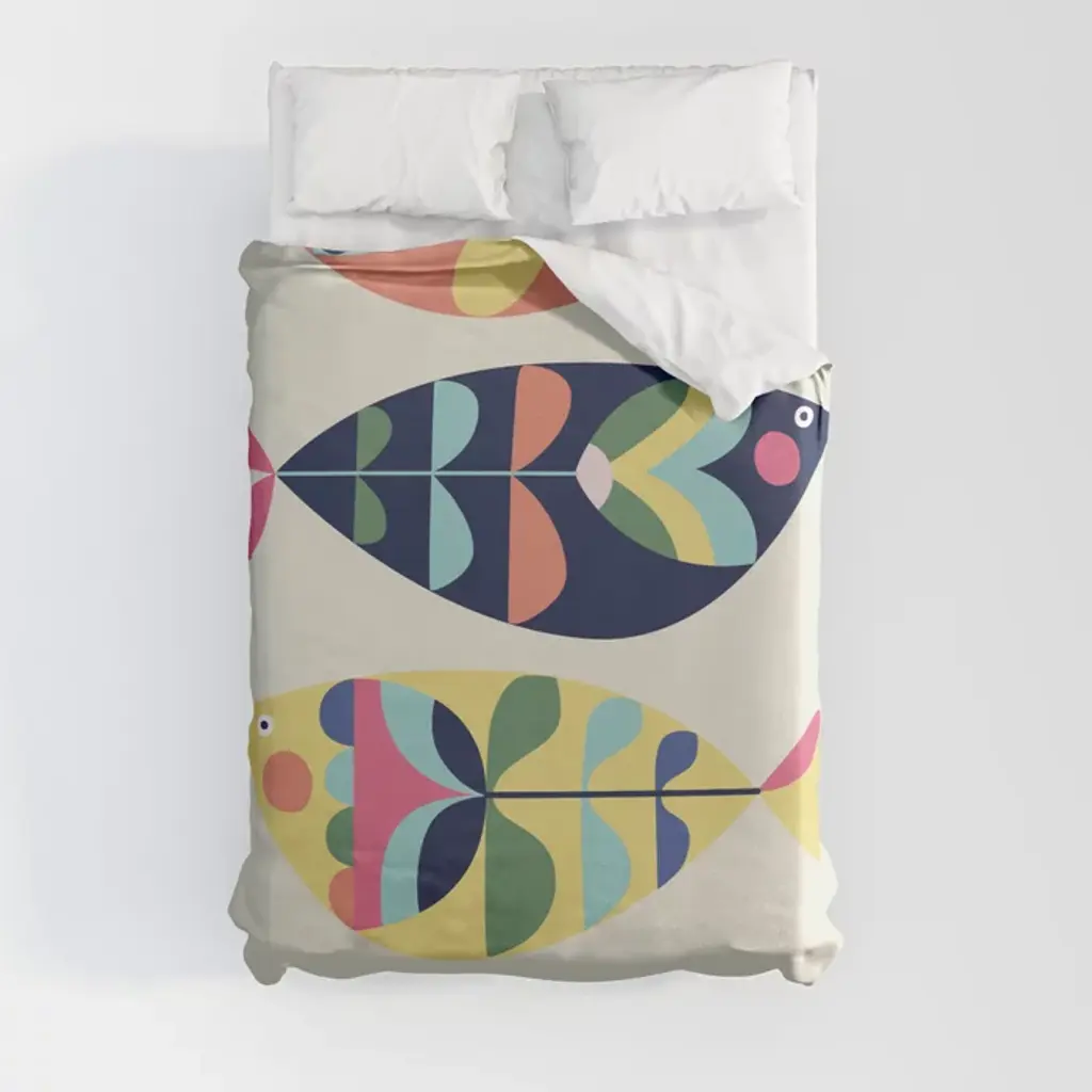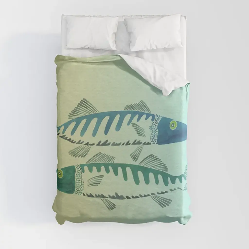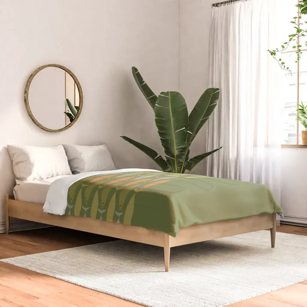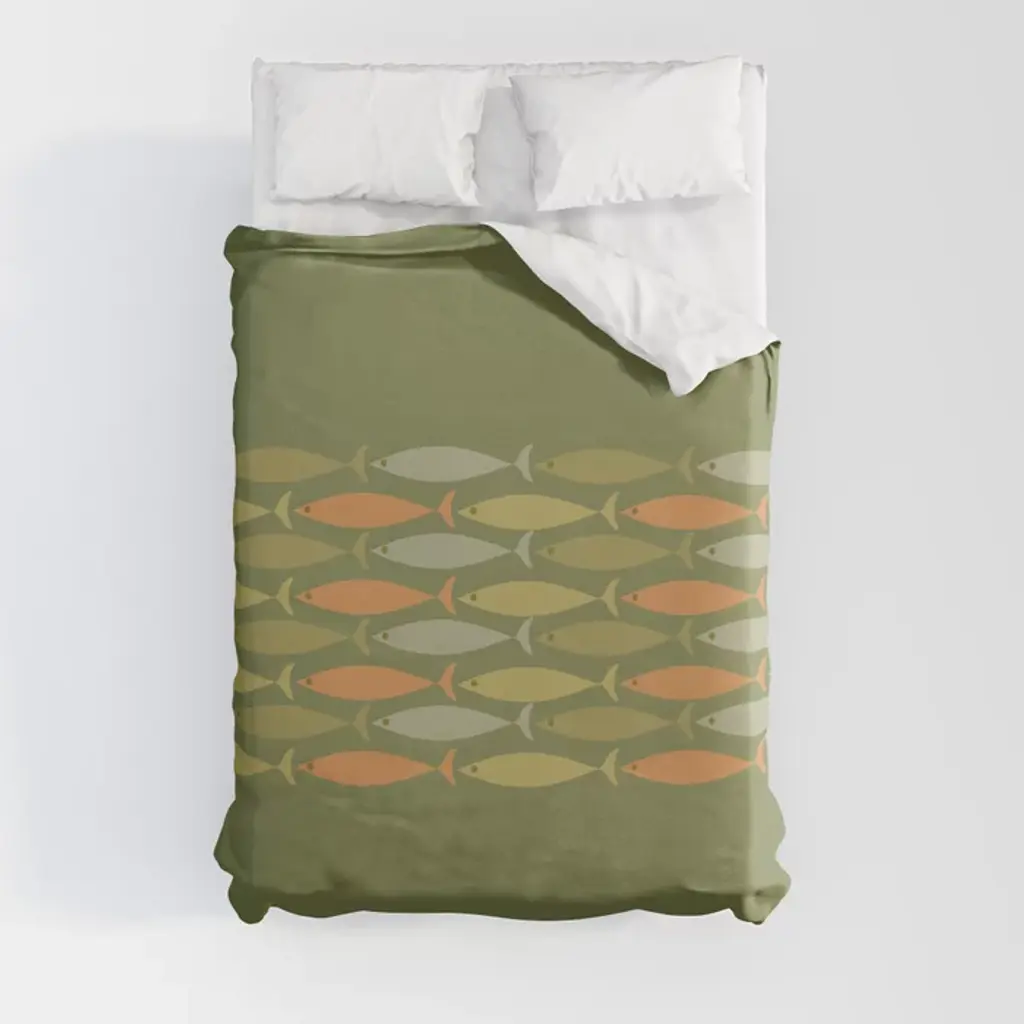 Fish Stripe 8 Mid Century Modern Minimalist Olive Green, Celadon, And Orange Comforter
