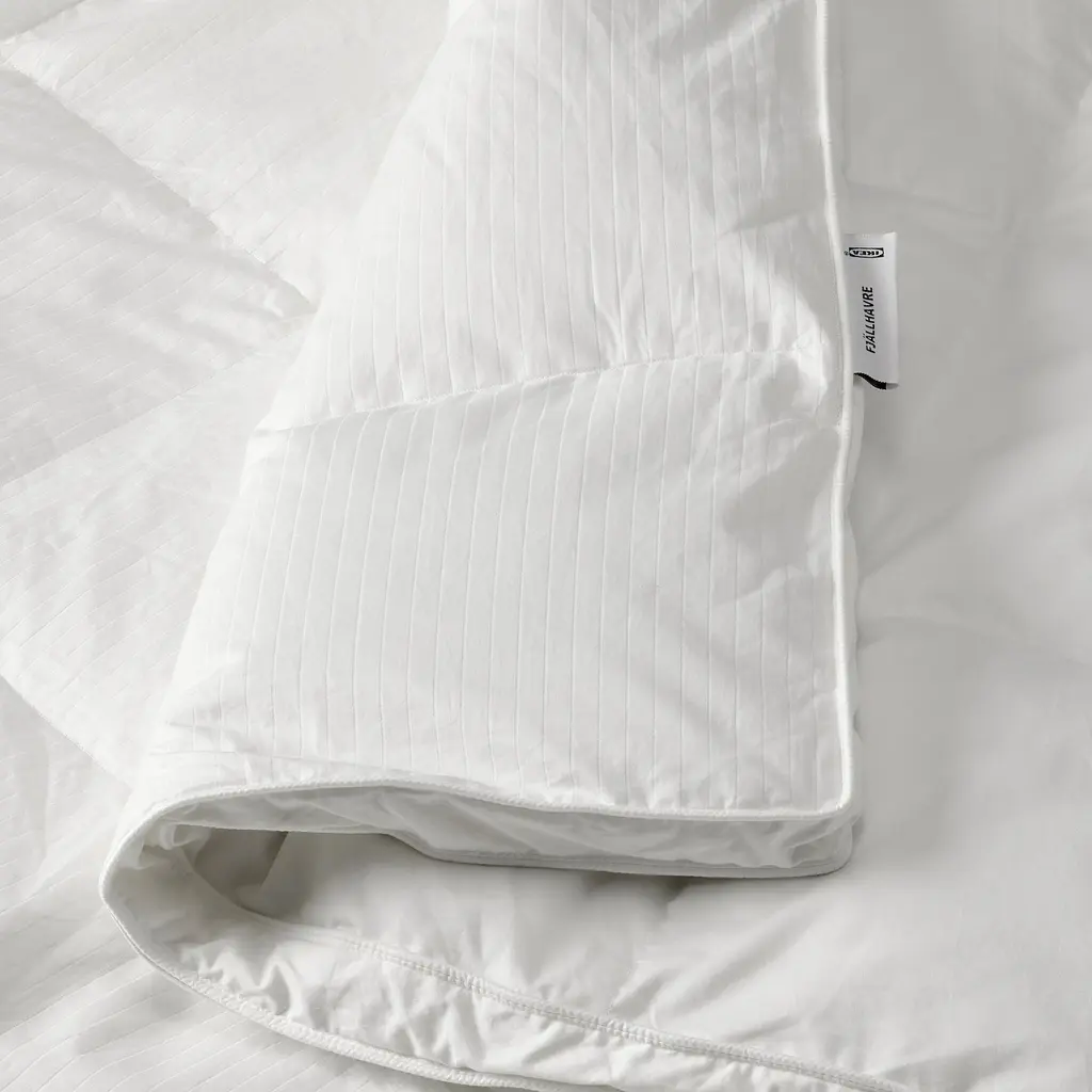 FJÄLLHAVRE Comforter, warm King. A warm comforter in soft, dobby woven cotton, with down/feather filling. The side walls make this comforter extra thick and fluffy. The stitched inner walls retain the heat, giving you a warmer sleep environment. A good choice if you often feel cold while sleeping.
