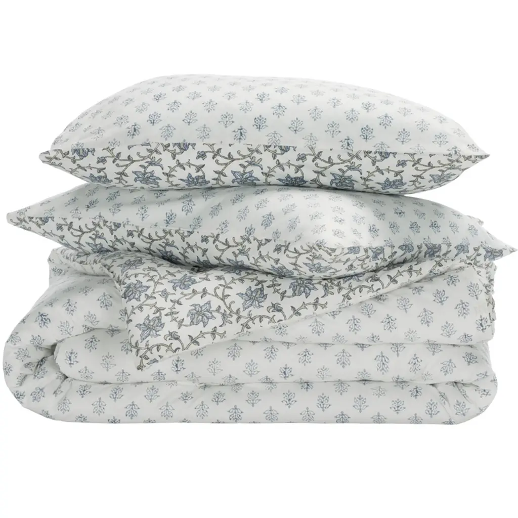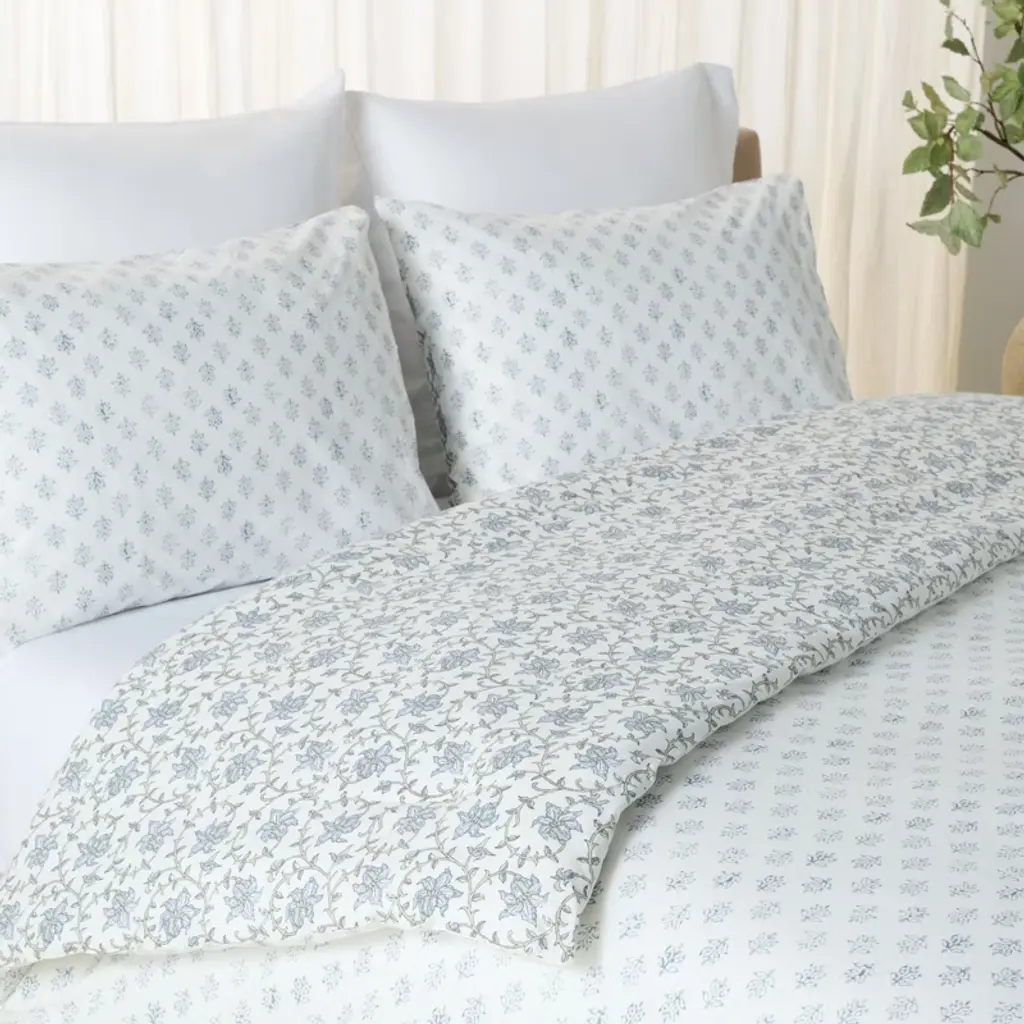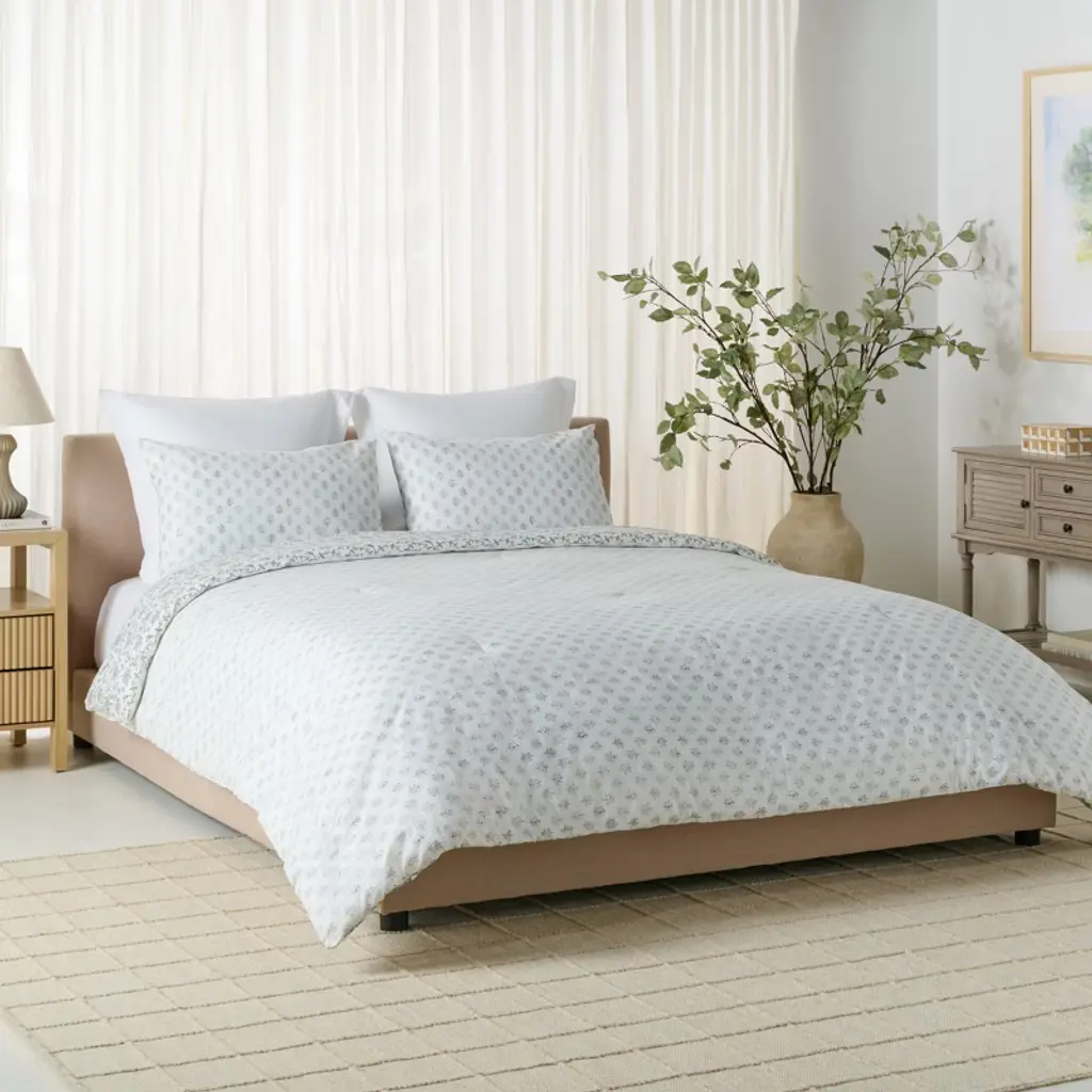 Transform your bedroom into a serene sanctuary with the Floral Reversible Comforter Set. Crafted from 100% cotton with a 144-thread count, this comforter set delivers a soft, breathable feel that ensures comfort throughout the seasons. The calming hues of blue mist and sage green create a peaceful ambiance in any space. Designed with versatility in mind, the comforter features a vibrant vine floral block print on one side and a small-scale block print on the revers, perfect for refreshing your bedroom style with ease. Subtle tufting adds gentle texture and visual dimension, enhancing the overall design while maintaining a clean and inviting look. The comforter is filled with 100% polyester at a 200 GSM fill weight, offering lightweight warmth ideal for year-round use and mild winters. Pillow covers are included and designed with envelope-style closures for a tidy, tailored finish. Packaged in a clear PVC bag with rope-style handles, this 3-piece comforter set is both practical and gift-ready. Whether for yourself or someone special, enjoy the perfect balance of comfort, beauty, and style with this charming addition to your bedroom decor.
