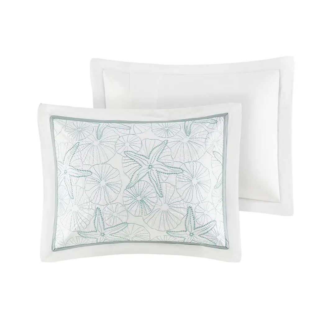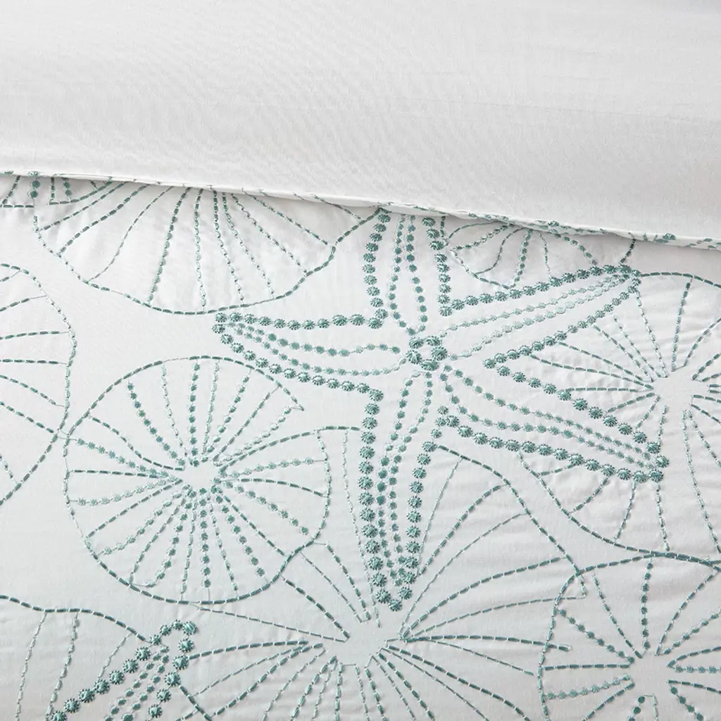 Experience the serene aura of the sea with our Coastal Cotton Comforter Set. This beach-themed bedding ensemble showcases a soothing dark seafoam blue accent, adorned with exquisite seashell and sand dollar embroidery. Crafted from 200-thread-count cotton, this oversized and overfilled set includes a comforter, 2 shams, and a coordinating bed skirt to complete the coastal look. To further complement your decor, consider our matching Euro shams and coordinating decorative pillows, available separately. Rest assured, this OEKO-TEX certified bedding set ensures comfort and wellness, free from any harmful substances. Please note that the set may arrive in rolled or compressed packaging and will require fluffing.