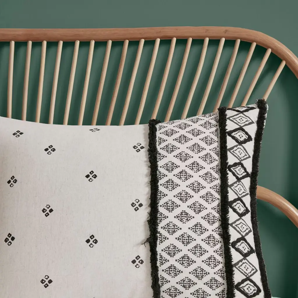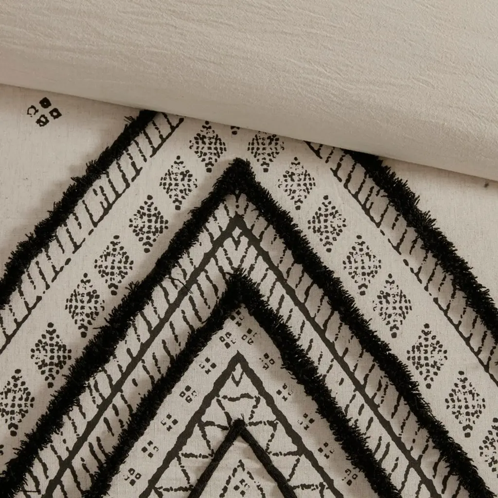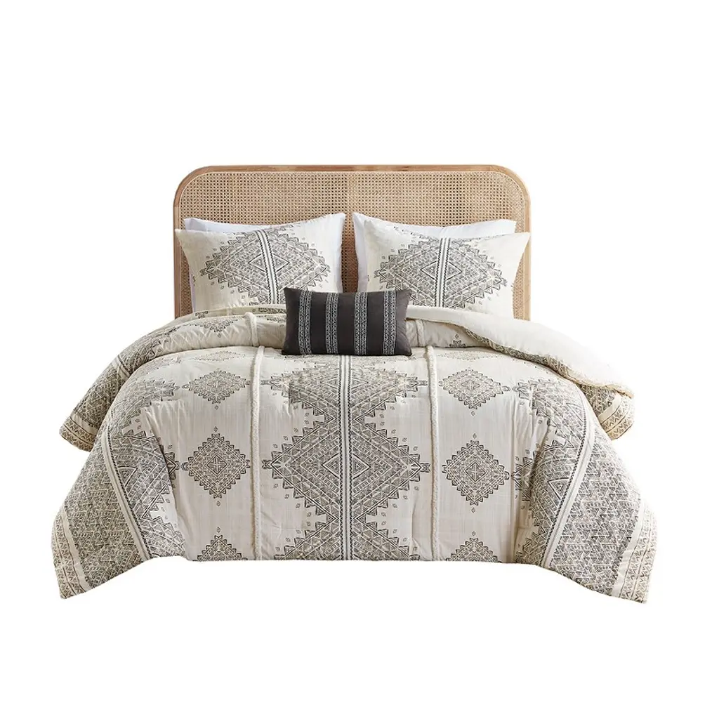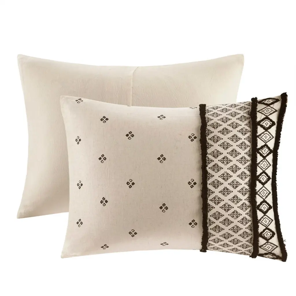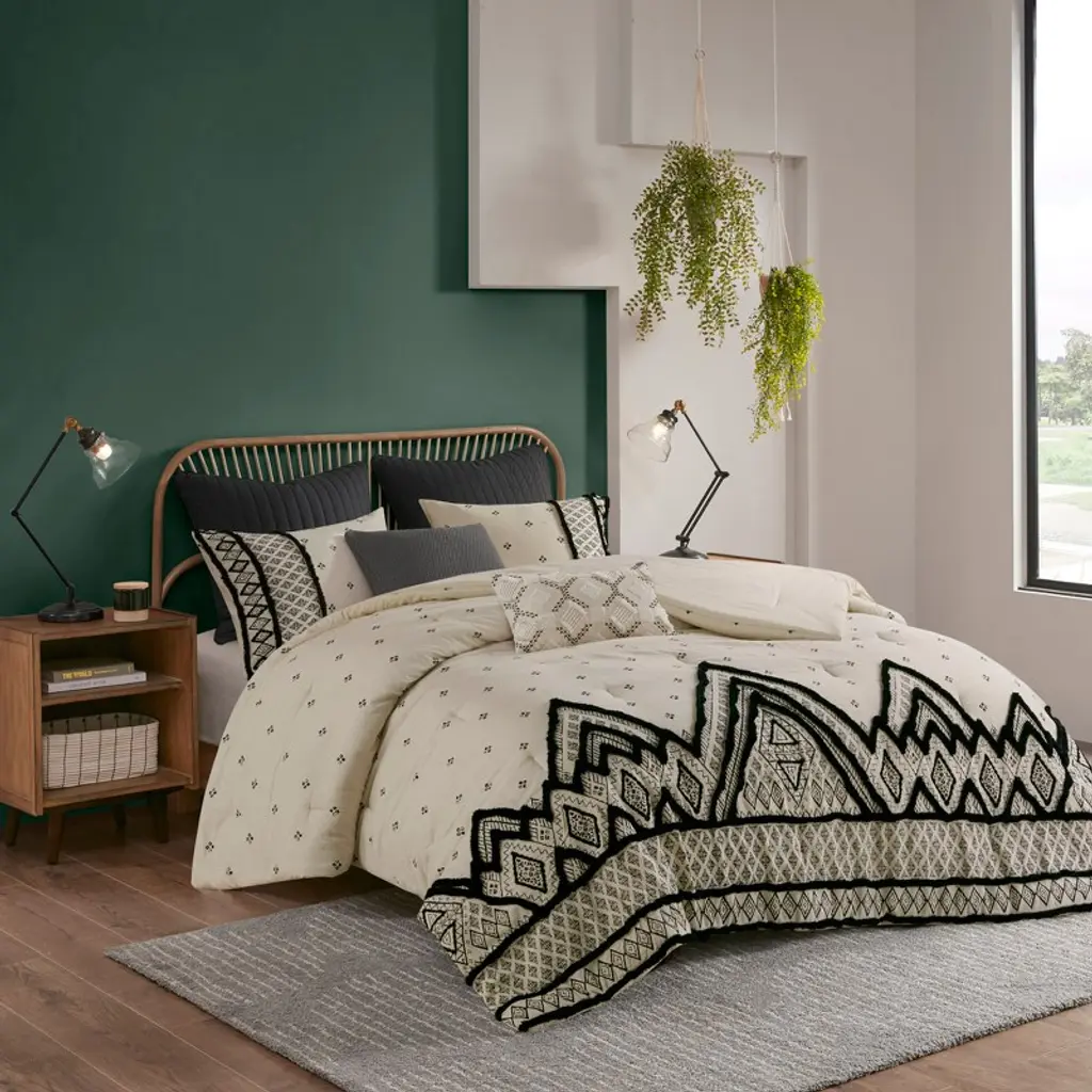 Transform your bedroom with the Boho Eclectic Cotton and Flax Linen Blend Comforter Set. This unique set features a natural-hued comforter and shams with a black diamond print and black chenille textured trim, creating a globally inspired look. Crafted from a blend of cotton and flax linen, these materials offer a crisp, natural texture. The hidden bar tacking gives the comforter a clean, duvet-like finish, adding to the modern-boho aesthetic. This machine washable comforter set combines both style and comfort, elevating the overall appeal of your bedroom.