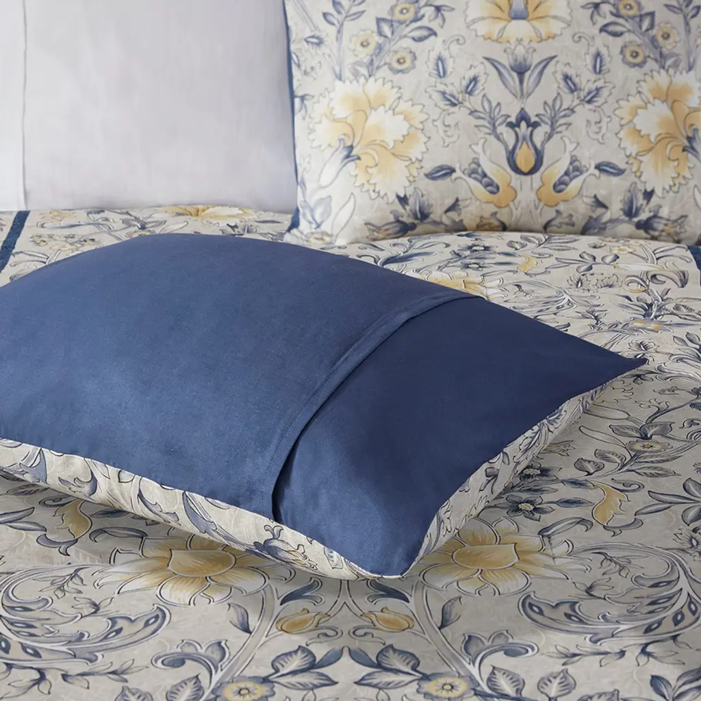 Upgrade your bedroom with the timeless elegance of the Botanical Bliss 6-Piece Cotton Comforter Set. Crafted from 100% cotton slub, the comforter features a stunning botanical print in soothing yellow and blue tones, complemented by a solid blue reverse for a sophisticated cottage aesthetic. The set includes two matching shams, an oversized and overfilled comforter, and two decorative pillows (one oblong, one square) to add an extra touch of style. A solid blue bed skirt provides a polished finish, completing the charming farmhouse look of this cotton comforter set. Additionally, this bedding set is OEKO-TEX certified, guaranteeing that it is free from harmful substances and chemicals, ensuring both quality comfort and wellness. Please note that this set may arrive in rolled or compressed packaging and will need to be fluffed up. A steam iron can be used to help remove any wrinkles more easily. Elevate your sleep space with the timeless charm and quality craftsmanship of the Botanical Bliss 6-Piece Cotton Comforter Set.