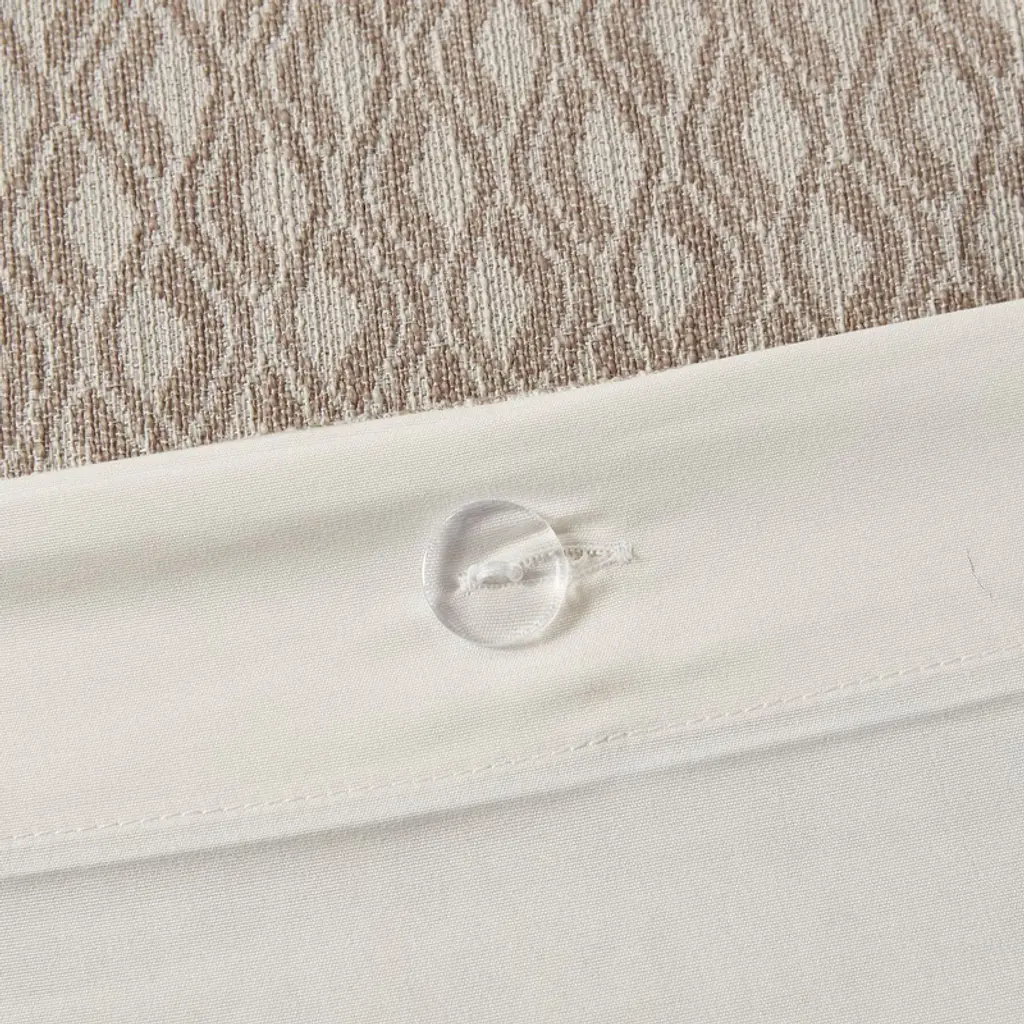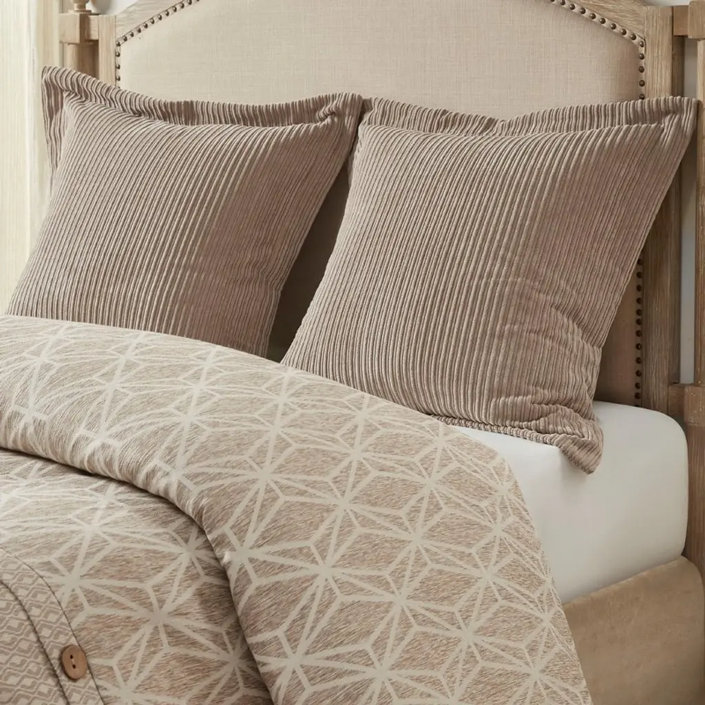 Elevate your bedroom with the luxurious style of the 8-piece Geometric Oversized Jacquard Comforter Set. This set features an oversized jacquard comforter with two elegant geometric patterns in taupe and ivory, embellished with decorative button accents for a glamorous look. The overfilled removable insert, secured by inner ties and a button closure, delivers a clean duvet-style aesthetic, eliminating visible bartacking lines from the top of the bed. The set also includes two shams and two Euro shams (three in King size) that beautifully pair with the comforter, along with two square decorative pillows and one oblong decorative pillow providing the perfect finishing touches to complete this luxury bedding set. Each decorative pillow features a removable cover with a hidden zipper closure and a unique ottoman weave, faux fur, or pieced design. The Comforter Cover is dry clean only, while the Comforter Insert is machine washable. Elevate your sleeping space with this opulent and sophisticated comforter set.