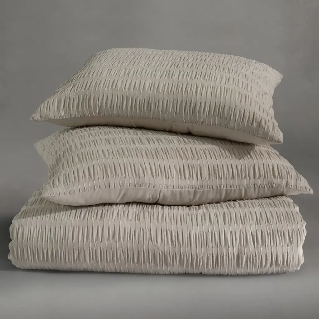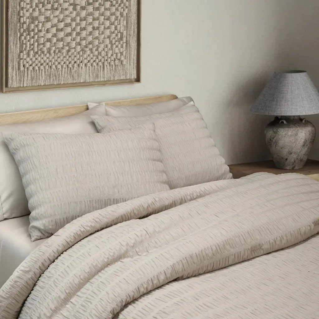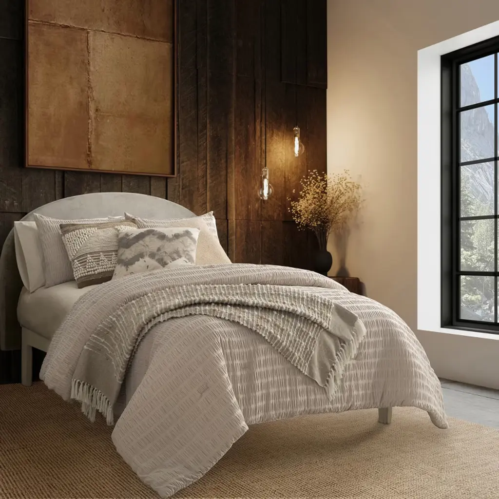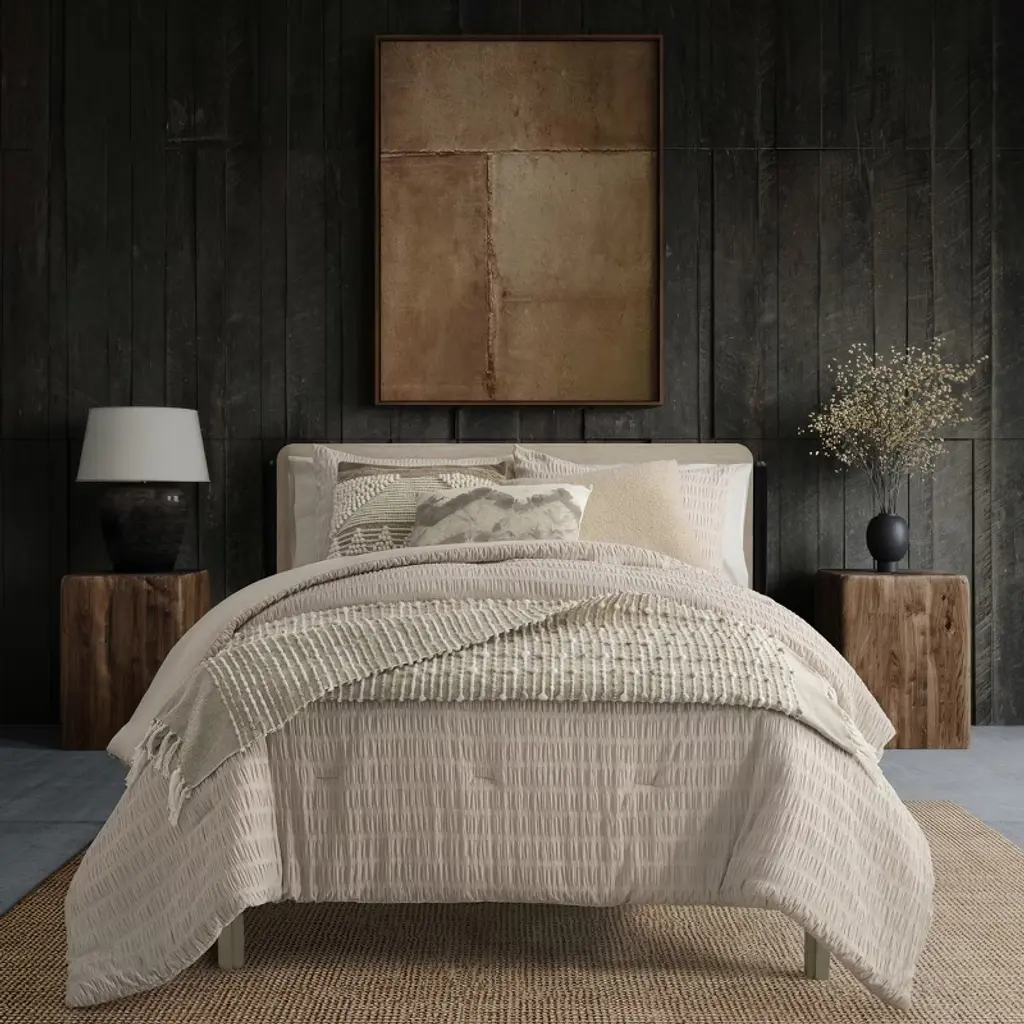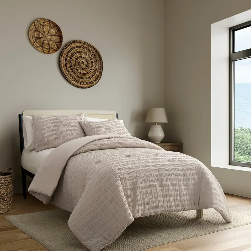Bring luxury and comfort to everyday living with the Noriah Ruched Stripe Comforter Set by Indigo Road, a brand founded by renowned designer, HGTV star, and real estate broker Egypt Sherrod. Guided by her belief that your home should feel good from the inside out, this rich textured comforter with solid, neutral tones make it an easy addition to any bedroom, from modern to traditional, while the ruched stripes add a unique twist. The subtle texture and soothing color create a serene, peaceful ambience, ideal for a restful and inviting sleep environment. Set includes 1 comforter and 2 shams. To care for your comforter set, machine wash cold on gentle cycle. Use non-chlorine bleach when needed. Tumble dry on low heat. Do not iron. Machine wash cold on gentle cycle. Use non-chlorine bleach when needed. Tumble dry on low heat. Do not iron.