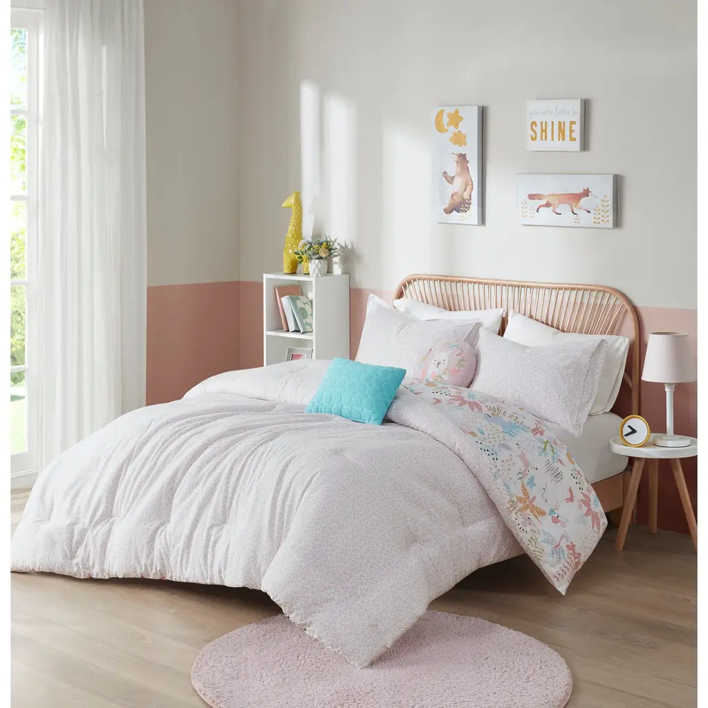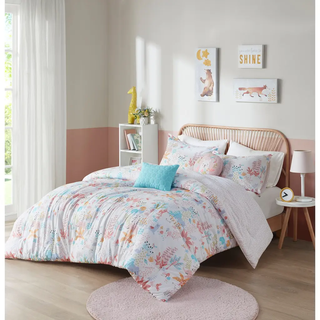 Cuddle up with your favorite animal friends with the Intelligent Design Kids Kinsley Woodland Animals Cotton Reversible Comforter Set. This cotton comforter features cute woodland creatures in a forest with a ditsy floral pattern on the reverse. The 2 matching shams (1 in Twin) repeat the pattern of the woodland animal comforter to create an adorable and whimsical look. Also included are 2 decorative pillows to complete the reversible comforter set. This kid's comforter set is OEKO-TEX certified, meaning it does not contain any harmful substances or chemicals, and uses an antimicrobial treatment that provides built-in freshness protection, reducing the growth of odor causing bacteria to keep fabric lasting longer.Features:Twin Dimensions: Full/ Queen Dimensions: