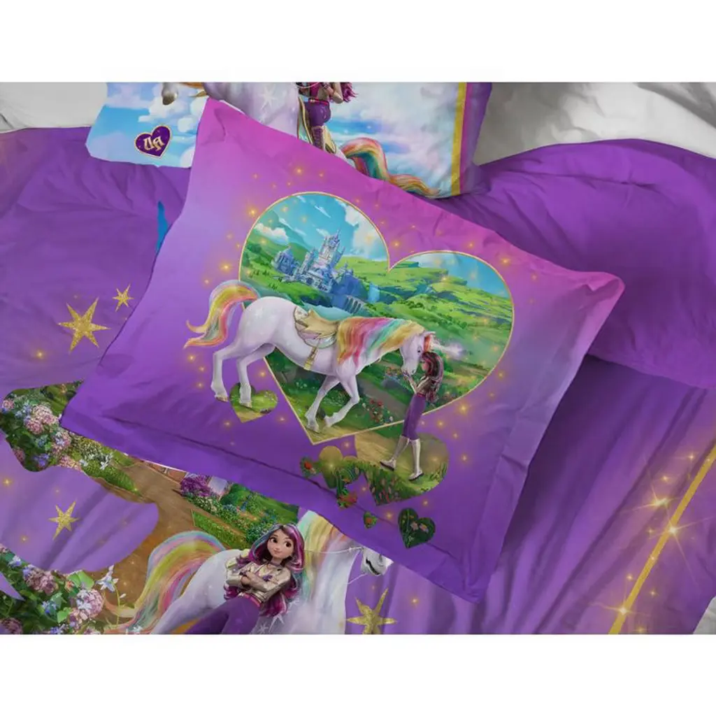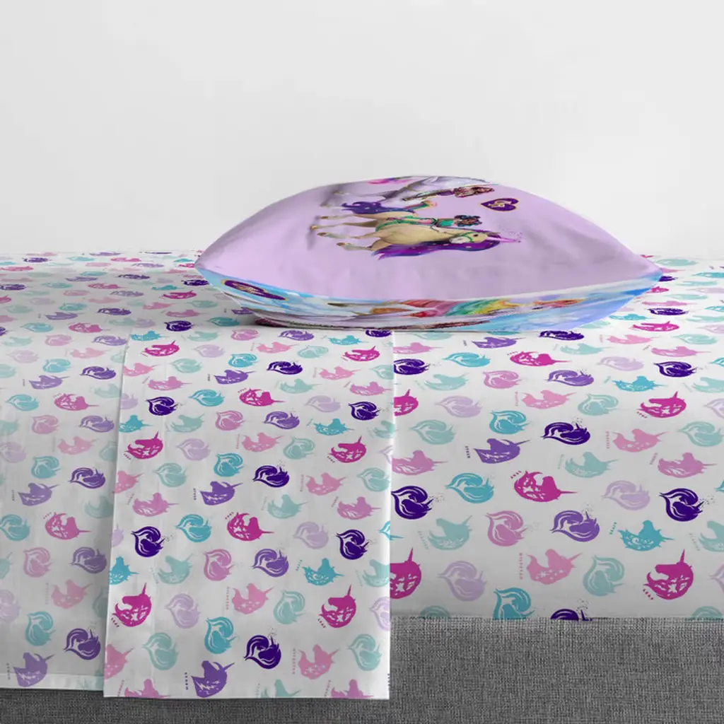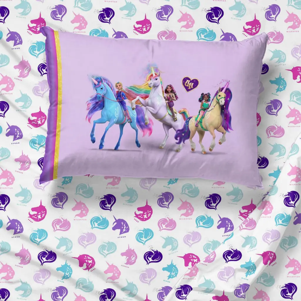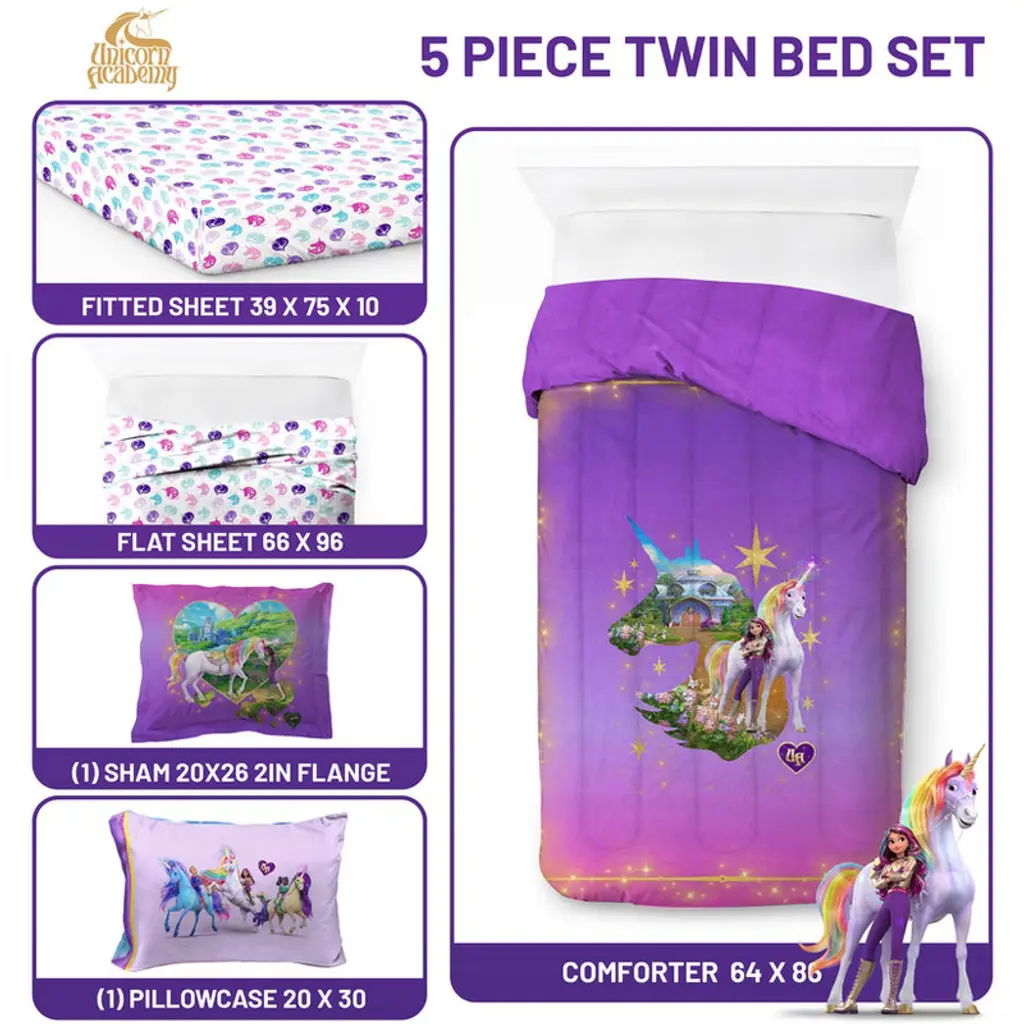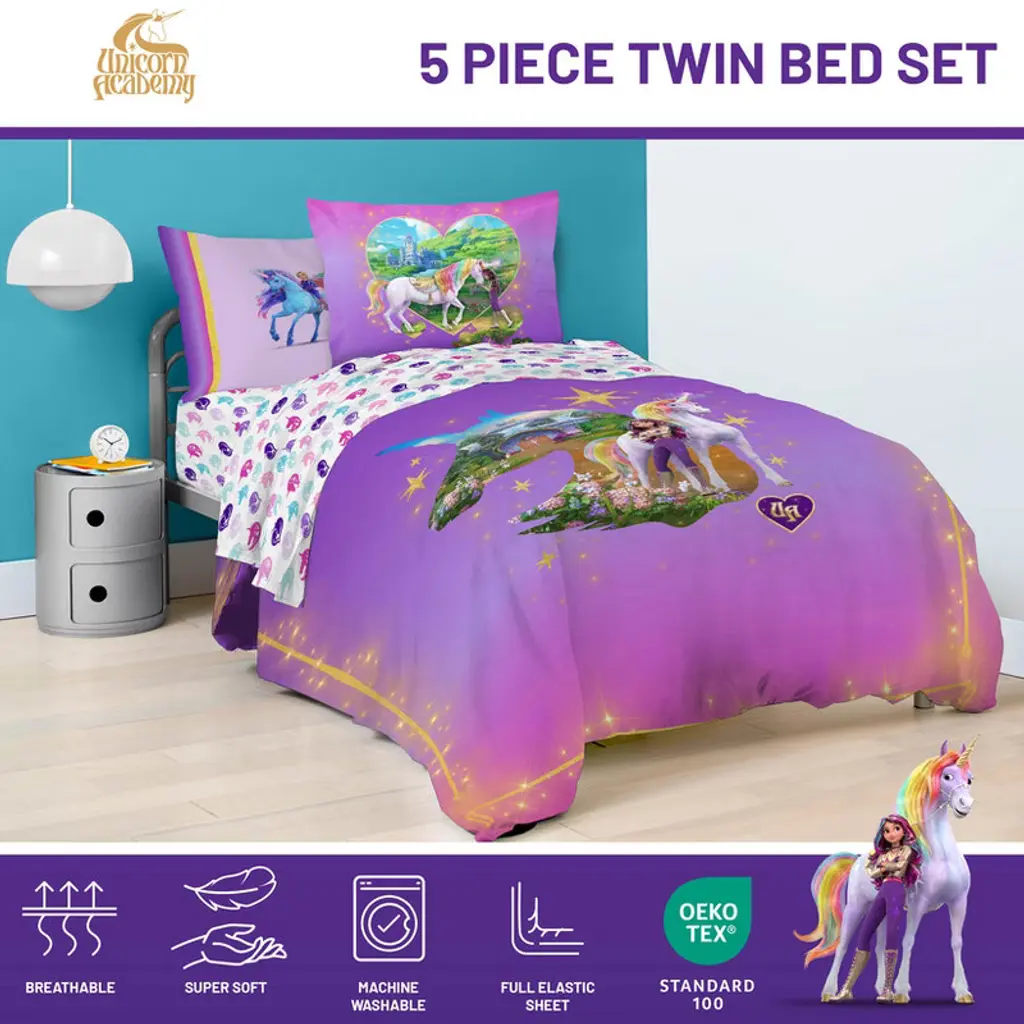 Featuring vibrant designs with Sophia Mendoza and Wildstar, this set sparks imagination and adds a playful touch to any children's room decor. Your child will love snuggling up with their favorite magical unicorns every night. Parents will appreciate the easy-care nature of this set. It's machine washable and long lasting, keeping the colorful designs looking great wash after wash. Simply machine wash in cold water and tumble dry on low heat. Perfect for everyday use, sleepovers, or as a thoughtful gift for birthdays and holidays. Suitable for both boys and girls, this versatile bedding set is more than just bedding it's a ticket to dreamland adventures! Give your child the gift of magical nights and restful sleep with our Unicorn Academy Twin Bedding Set.