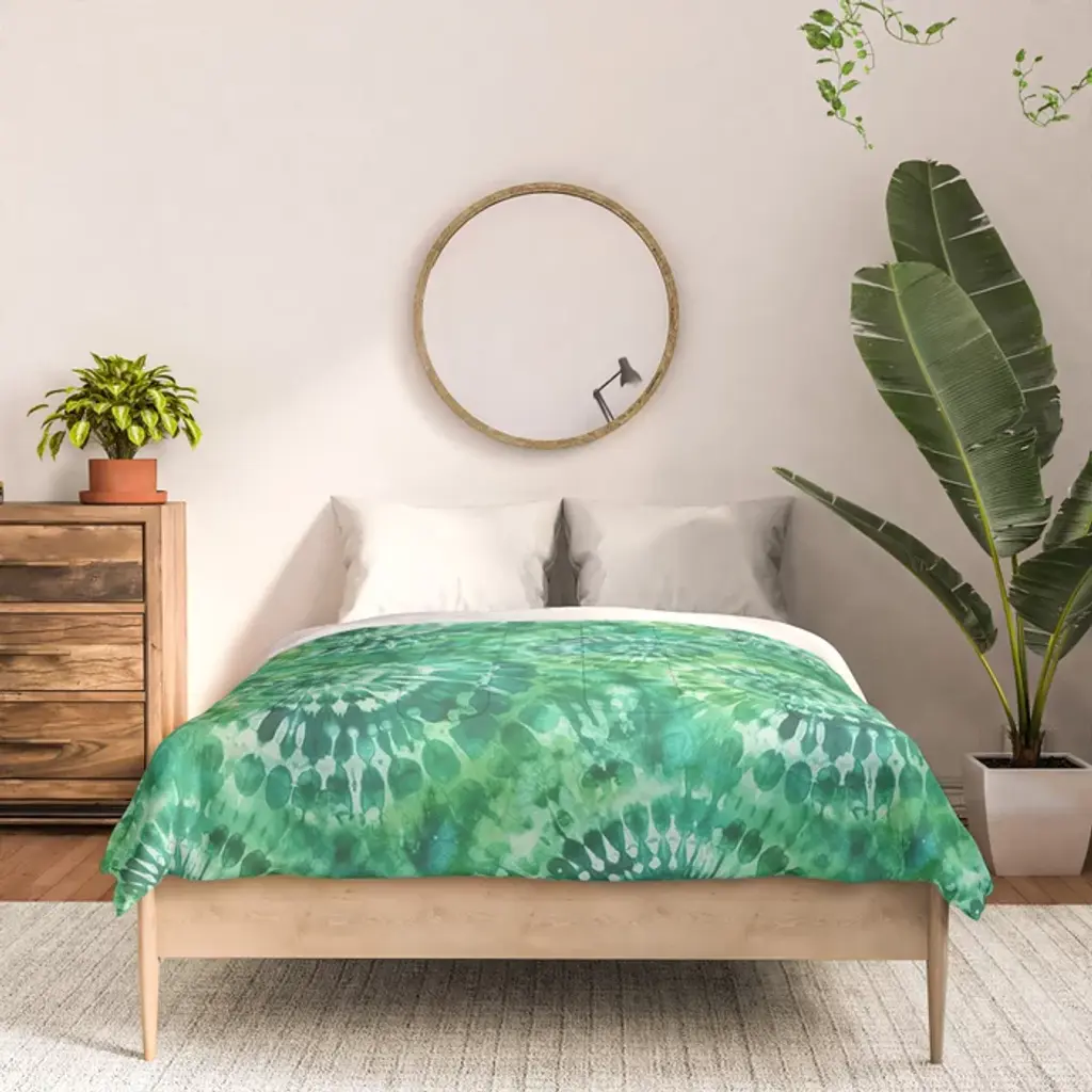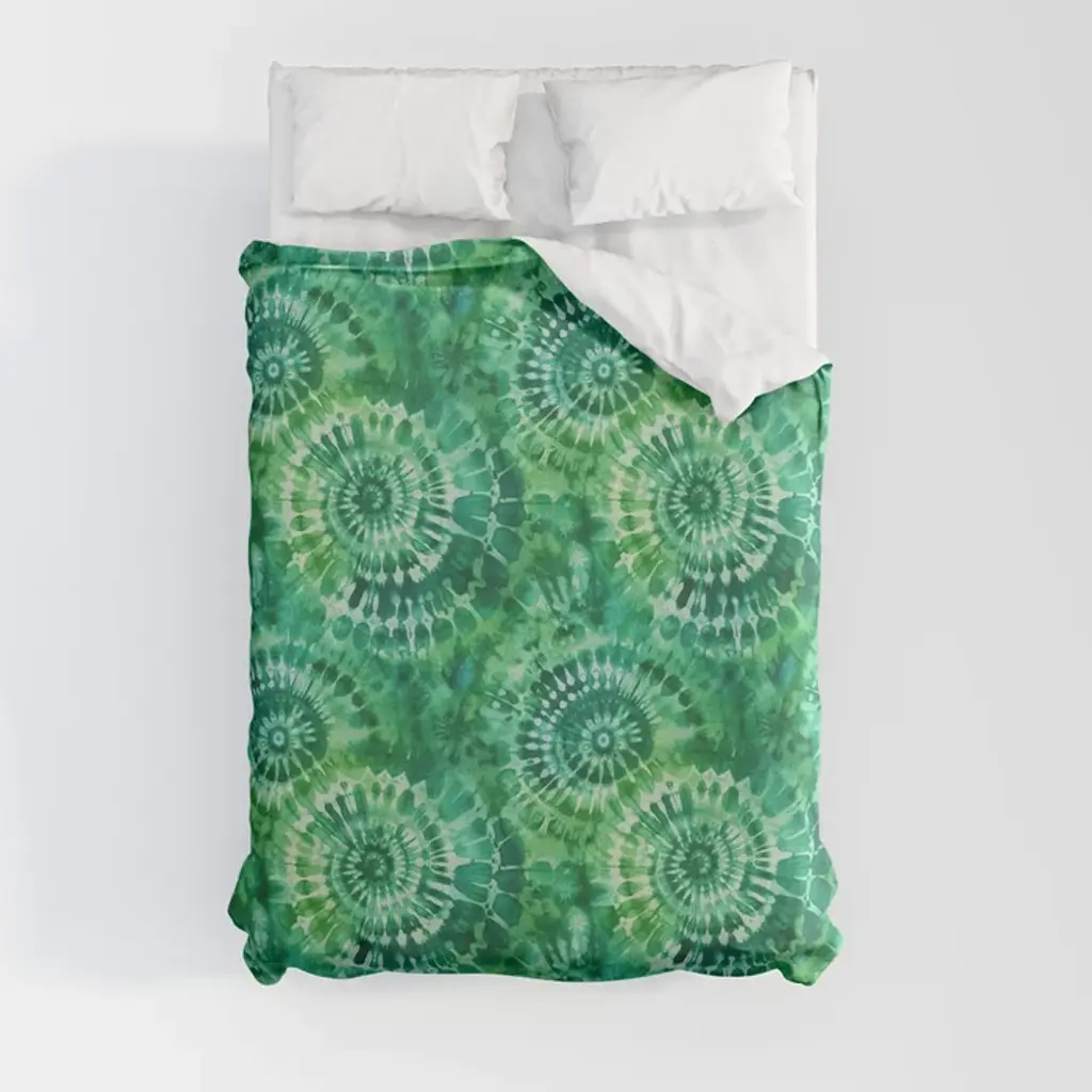 Jumbo Tie Dye Batik In Bright Green Circling Swirls On Teal Comforter