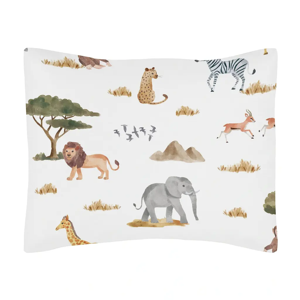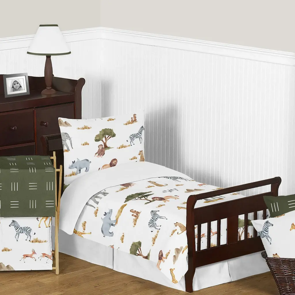 Transform your toddler's bedroom into a lively wildlife safari with the Jungle Animals 5pc Comforter Set by Sweet Jojo Designs. This gender-neutral bedding set features a charming hand-painted watercolor design of jungle animals including elephants, giraffes, lions, and monkeys. The modern color palette of hunter green, yellow, grey, black, and white enhances the vibrancy of the nature scene against the crisp white background. Made with premium brushed microfiber fabrics, this set is soft to the touch and easy to care for. Your child will love snuggling up in this cozy and stylish bedding set that fits all standard toddler beds.Features: