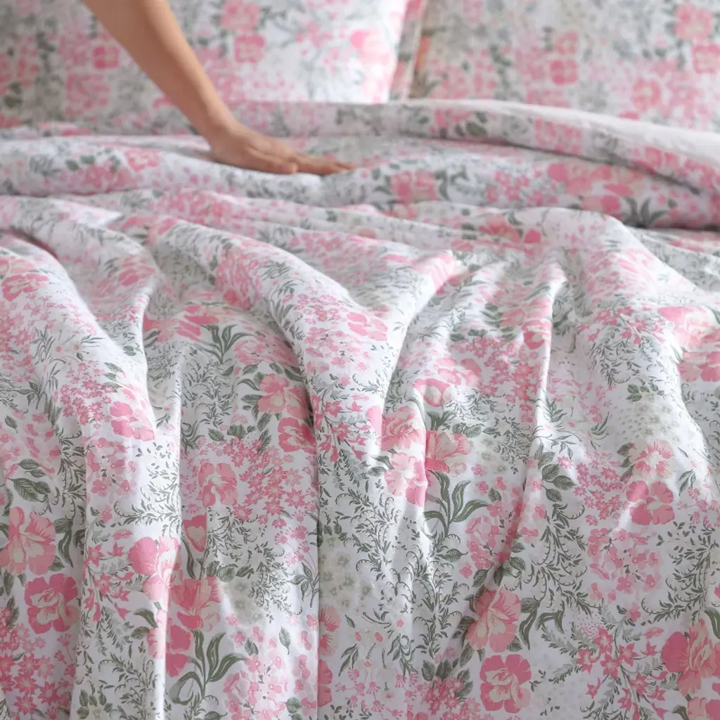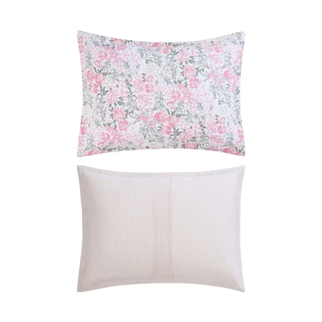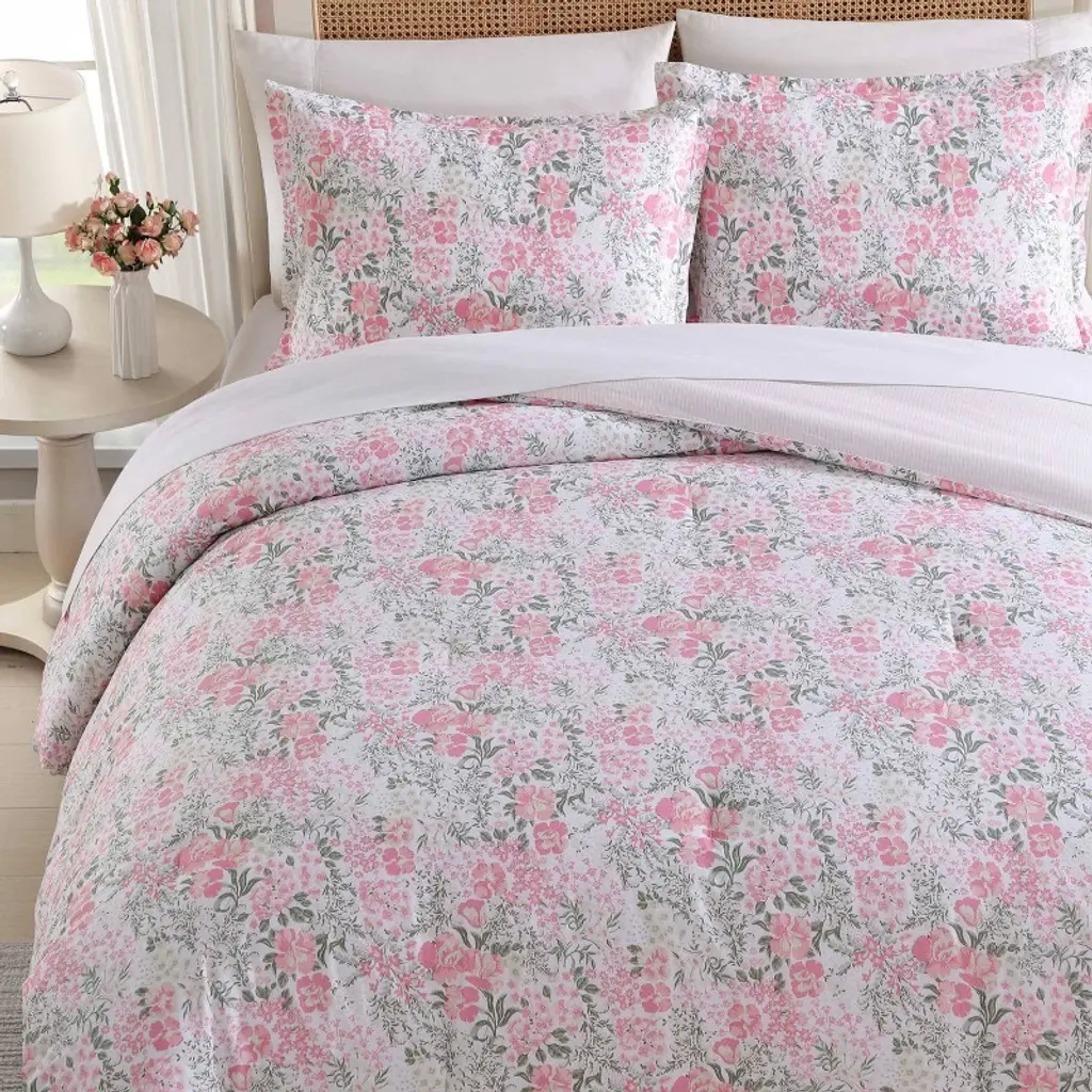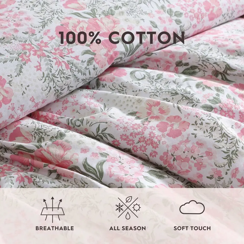 The Laura Ashley Heather Garden comforter and sham set showcases a romantic floral design in soft pink and green hues, bringing a fresh and timeless charm to your bedroom. Blending classic elegance with a modern touch, the delicate blooms create a serene and sophisticated atmosphere. The comforter features a smooth, breathable cotton exterior for all-season comfort, while the lightweight fill provides cozy warmth for a restful night’s sleep. Available in twin, full/queen, and king sizes, the set includes one comforter and two coordinating shams (1 for twin size). Machine washable for easy care.