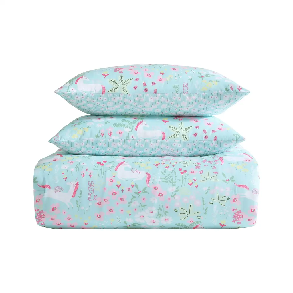 The Laura Ashley Kids Magical Unicorn Comforter Bonus Set in aqua blue and pink features enchanting unicorn designs, surrounded by a floral pattern in a soft and playful color palette. The combination of aqua blue and pink adds a dreamy and whimsical feel, making it a fantastic choice for a children's bedroom. Ensemble is constructed with 100% cozy microfiber and is a comfortable, medium weight that is perfect for year round use. Comforter fill is 100% polyester. Set includes one comforter, two standard shams (one for twin/twin XL set) and one bonus decorative pillow. Set is CPSIA tested, certified safe for children 12 and under and is machine washable for easy care.