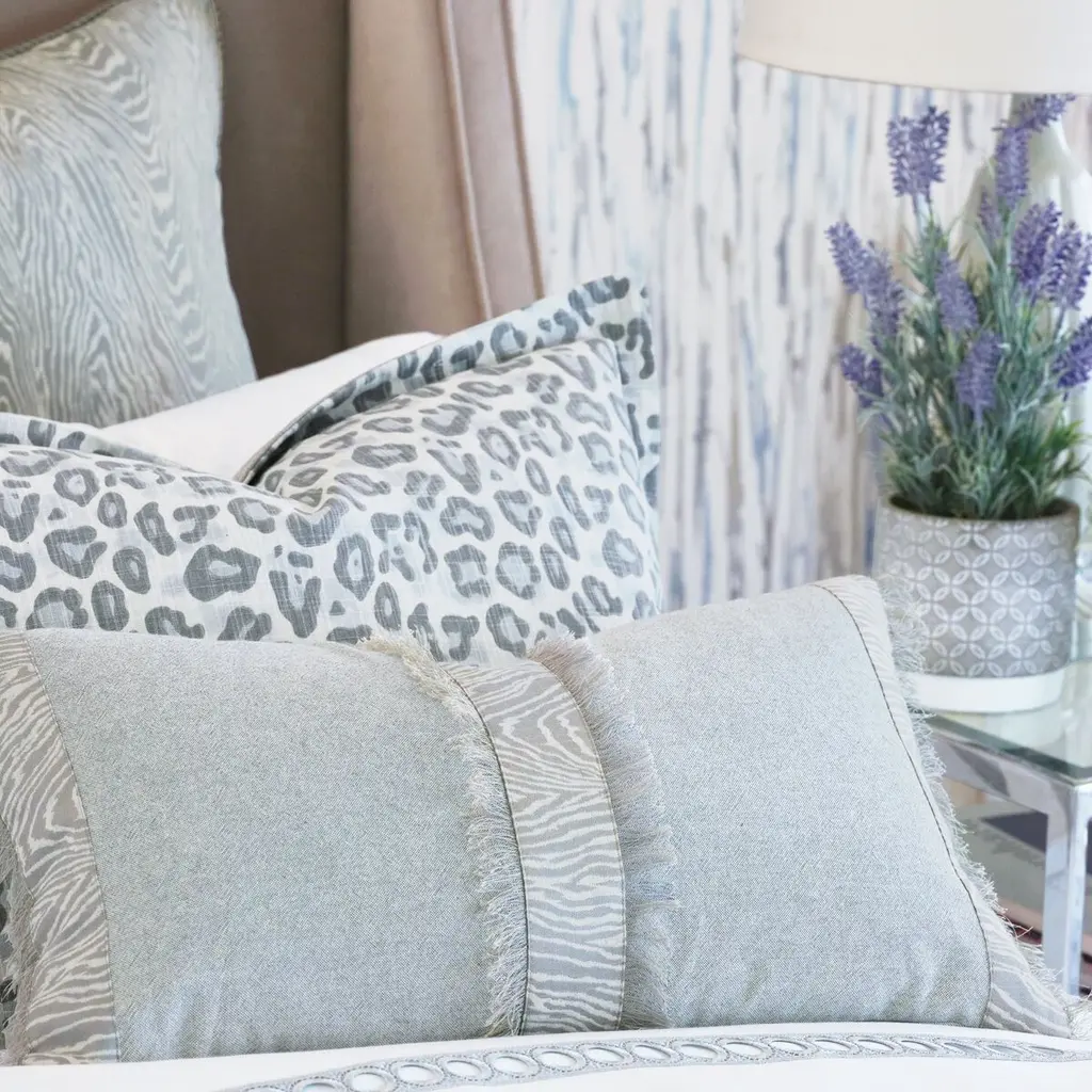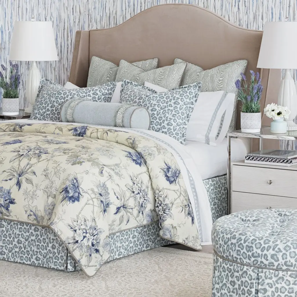 The graceful azaleas on the one side of this comforter are complemented by solid pewter fabric on the other. The batting in between has a one-inch loft, making this comforter a lightweight alternative to a duvet. Because it's hand-tacked rather than tufted, the stitches keeping the batting in place are barely visible.