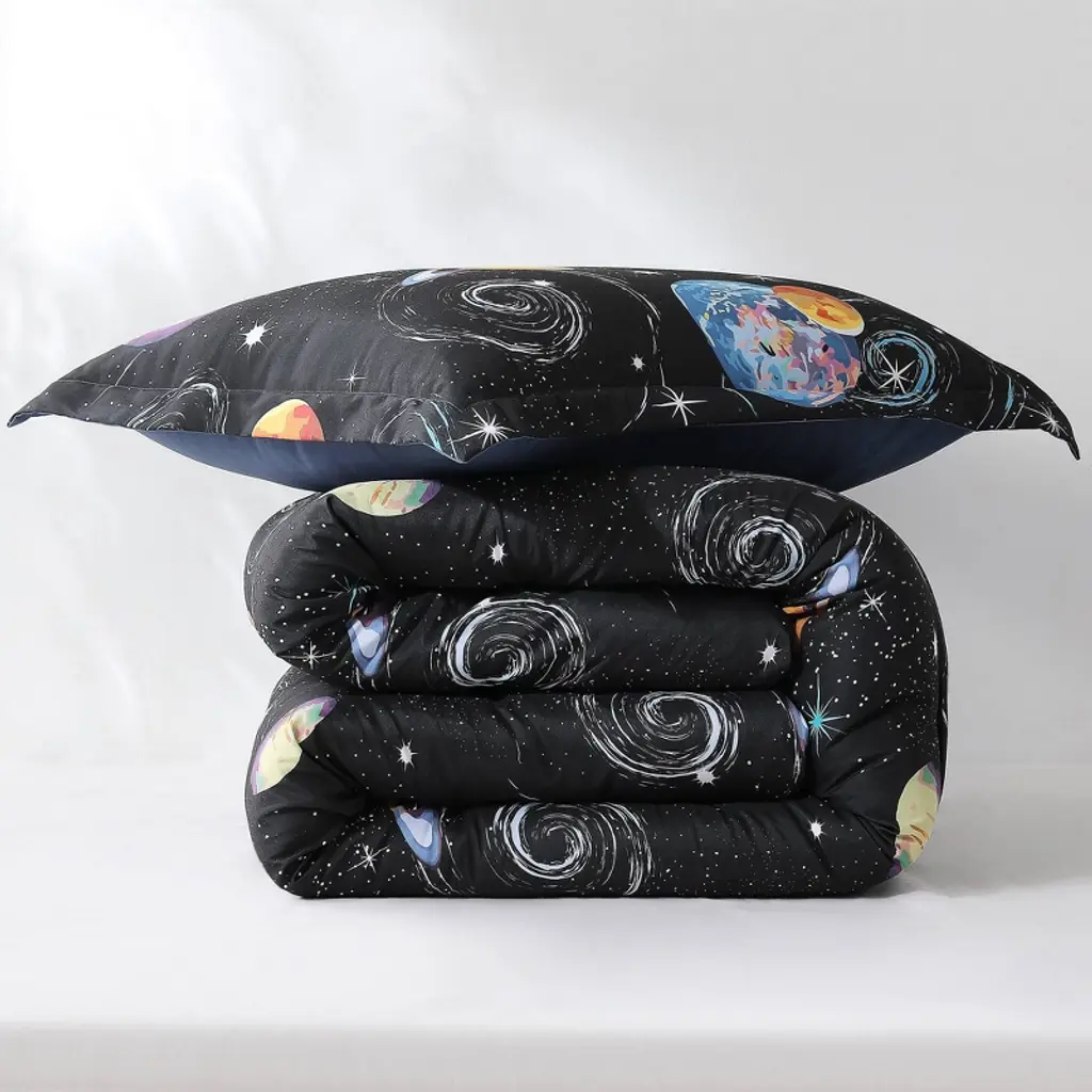 Your little astronaut will love this outer space themed kids comforter set! Featuring an out-of-this-world print of planets, stars, and galaxies floating in the universe, it makes the perfect addition to any science obsessed kids' or tweens' bedroom. Made with a soft microfiber and medium weight polyfill for year-round comfort. This all-in-one bedding set makes styling your child's bed a breeze! Including 1 comforter, 2 shams, 1 decorative pillow, 1 flat sheet, 1 fitted sheet with a 14" drop pocket, and 2 pillowcases. STANDARD 100 by OEKO-TEX® certified, all components have been tested and certified free from harmful substances. Machine washable.