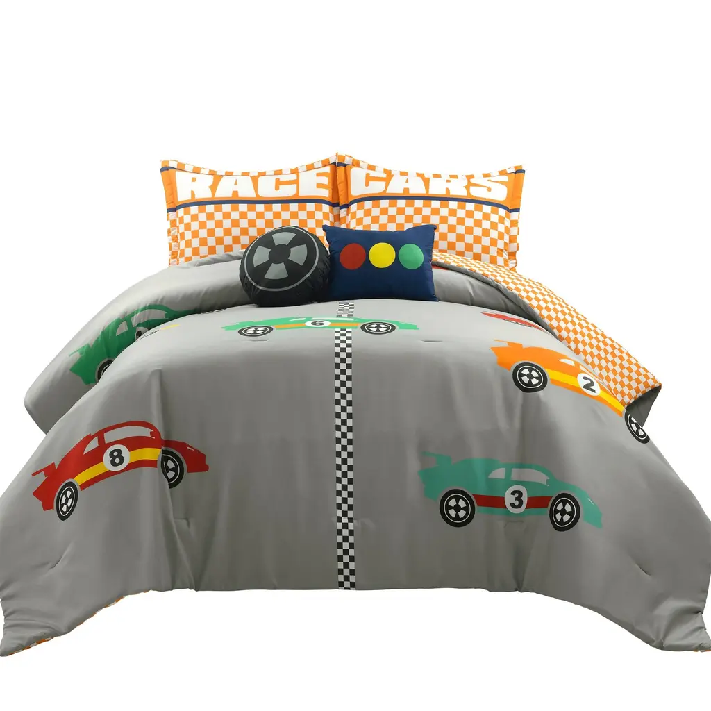 Steer into first place in parenting when you redecorate your kid’s bedroom with this colorful racing cars comforter set. Designed with racing cars, a checkered reverse and two accent pillows, this bedding set is all you'll need to fuel their imagination.Oversized for their comfort and designed for igniting their imagination, this bedding set features racing cars in a winning style. Decorated for the ultimate car lover, your child will love the model cars and checkered reverse. The steering wheel and traffic light pillow will have them feeling as if they are behind the wheel of their favorite vehicle. This set includes one comforter, matching sham(s) and two decorative pillows. Please refer to the product labels for full care instructions.Features:100% PolyesterReversibleUse Front Load Commercial Washer And Dryer. Machine Wash Separately In Cold Water On The Gentle Cycle. Use Only Non-Chlorine Bleach When Needed.Full/Queen:Twin:
