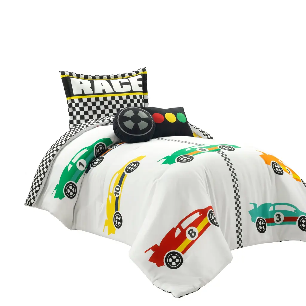Steer into first place in parenting when you redecorate your kid’s bedroom with this colorful racing cars comforter set. Designed with racing cars, a checkered reverse and two accent pillows, this bedding set is all you'll need to fuel their imagination.Oversized for their comfort and designed for igniting their imagination, this bedding set features racing cars in a winning style. Decorated for the ultimate car lover, your child will love the model cars and checkered reverse. The steering wheel and traffic light pillow will have them feeling as if they are behind the wheel of their favorite vehicle. This set includes one comforter, matching sham(s) and two decorative pillows. Please refer to the product labels for full care instructions.Features:100% PolyesterReversibleUse Front Load Commercial Washer And Dryer. Machine Wash Separately In Cold Water On The Gentle Cycle. Use Only Non-Chlorine Bleach When Needed.Full/Queen:Twin: