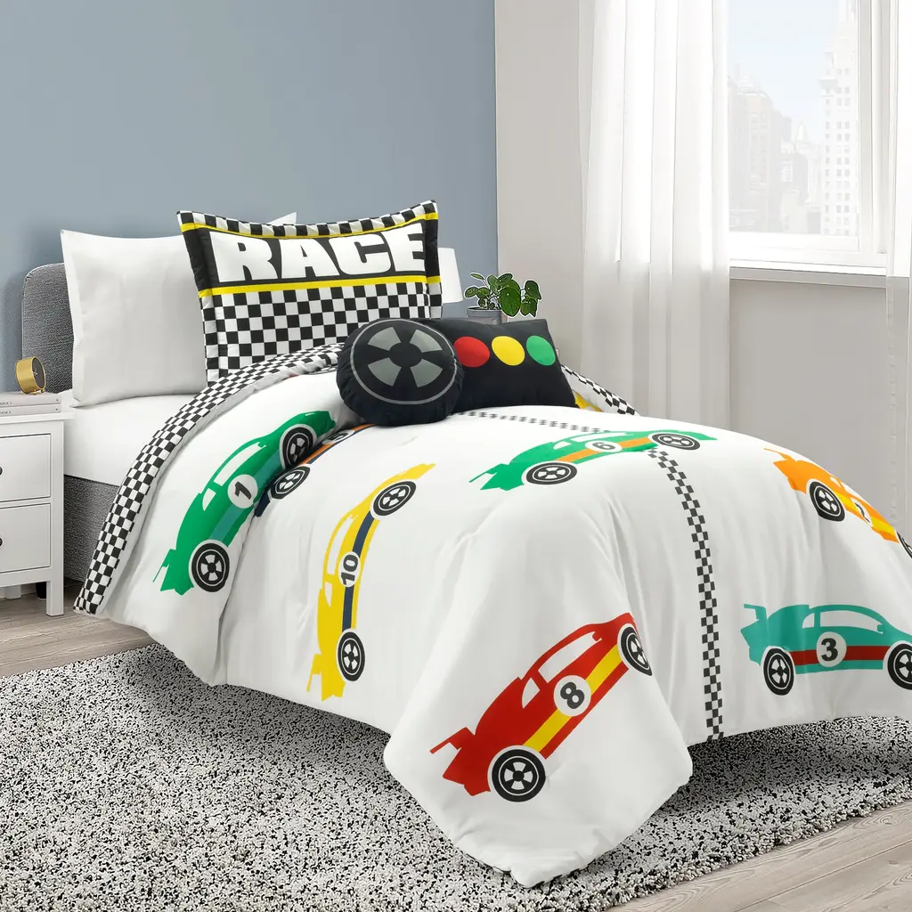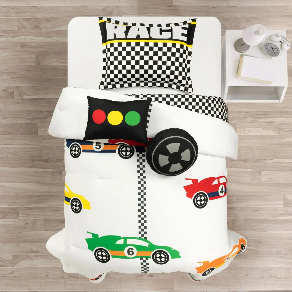 Steer into first place in parenting when you redecorate your kid’s bedroom with this colorful racing cars comforter set. Designed with racing cars, a checkered reverse and two accent pillows, this bedding set is all you'll need to fuel their imagination.Oversized for their comfort and designed for igniting their imagination, this bedding set features racing cars in a winning style. Decorated for the ultimate car lover, your child will love the model cars and checkered reverse. The steering wheel and traffic light pillow will have them feeling as if they are behind the wheel of their favorite vehicle. This set includes one comforter, matching sham(s) and two decorative pillows. Please refer to the product labels for full care instructions.Features:100% PolyesterReversibleUse Front Load Commercial Washer And Dryer. Machine Wash Separately In Cold Water On The Gentle Cycle. Use Only Non-Chlorine Bleach When Needed.Full/Queen:Twin: