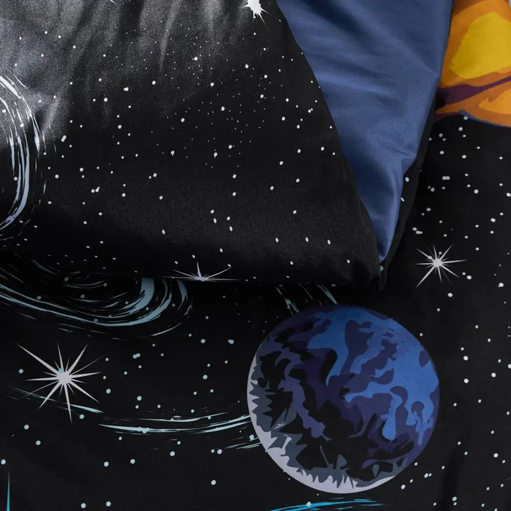 Your little astronaut will love this outer space themed kids comforter set! Featuring an out-of-this-world print of planets, stars, and galaxies floating in the universe, it makes the perfect addition to any science obsessed kids' or tweens' bedroom. Made with a soft microfiber and medium weight polyfill for year-round comfort. This all-in-one bedding set makes styling your child's bed a breeze! Including 1 comforter, 1 sham, 1 decorative pillow, 1 flat sheet, 1 fitted sheet with a 14" drop pocket, and 1 pillowcase. STANDARD 100 by OEKO-TEX® certified, all components have been tested and certified free from harmful substances. Machine washable.