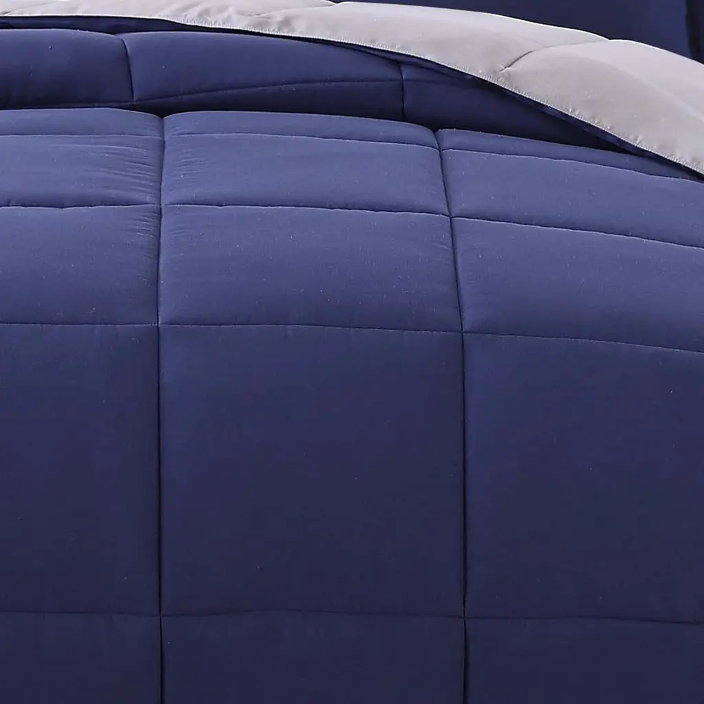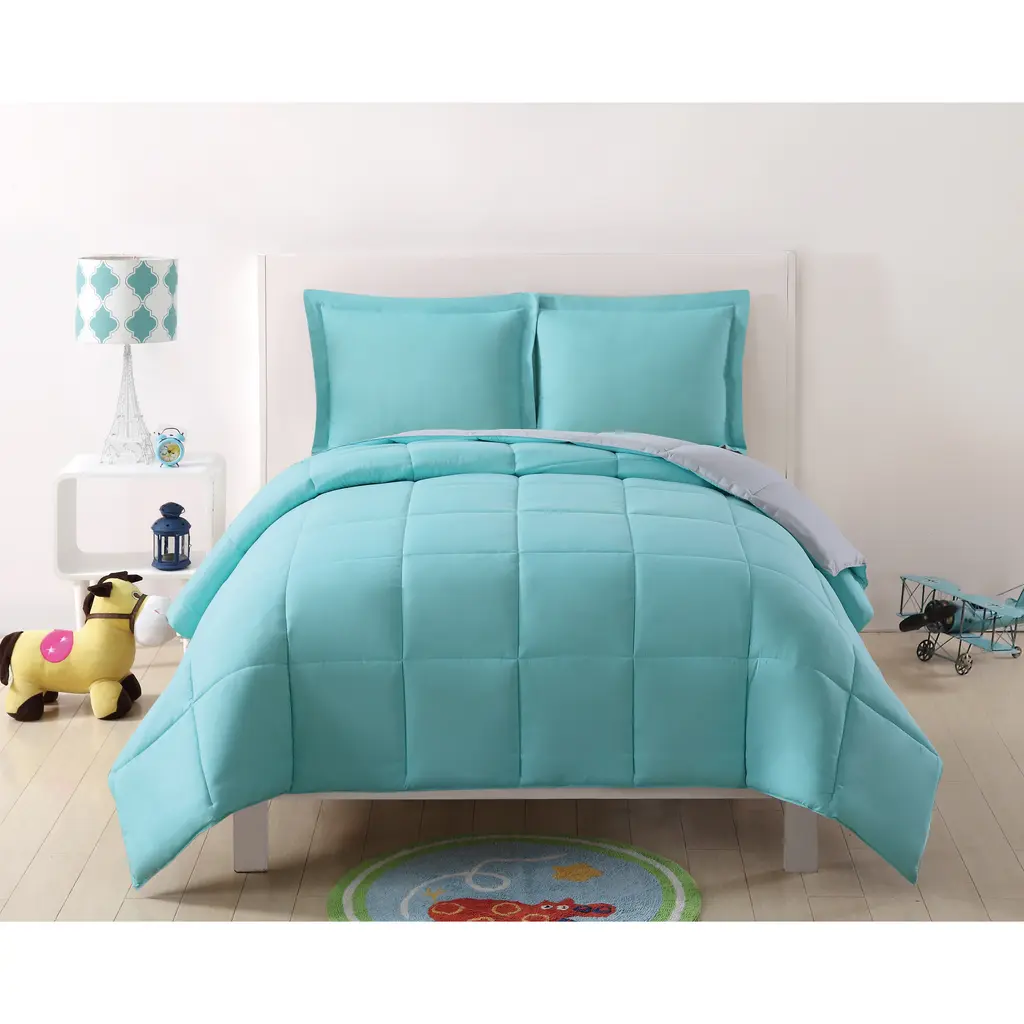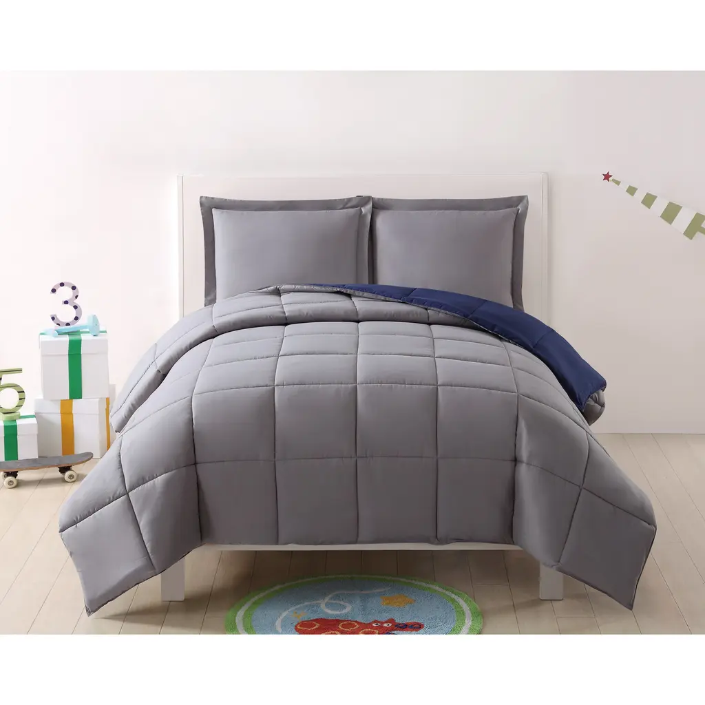 The My World 3 Piece Reversible Comforter set brings a pop of color to the bsaic bedding world. Soft, brushed microfiber is styled with playful colorways to fit any kid's bedroom decor. The durable fabric provides easy care and year round usability. Other products available from My World. Features: Gender: Unisex, Girls, Boys Product Features: Reversible Bedding Style: Classic Material: Polyester Pattern: Solid Color Care Instruction: Machine Wash Set Includes: 3 Piece, 2 Piece Exact Color: Navy Blue, Red/Grey, Turquoise, Lavender, Orange Color: Blue, Red, Grey, Pink, Purple, Orange Size: Twin XL, Full/ Queen Twin XL Dimensions:Comforter: 68 inches wide x 90 inches longSham: 20 inches wide x 26 inches longFull/Queen Dimensions:Comforter: 90 inches wide x 90 inches long2 Shams: 20 inches wide x 26 inches long