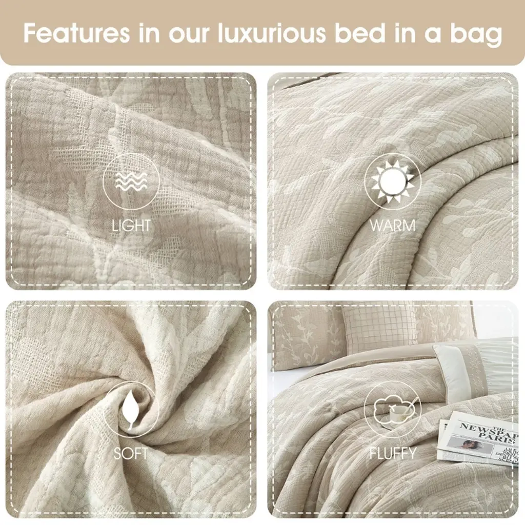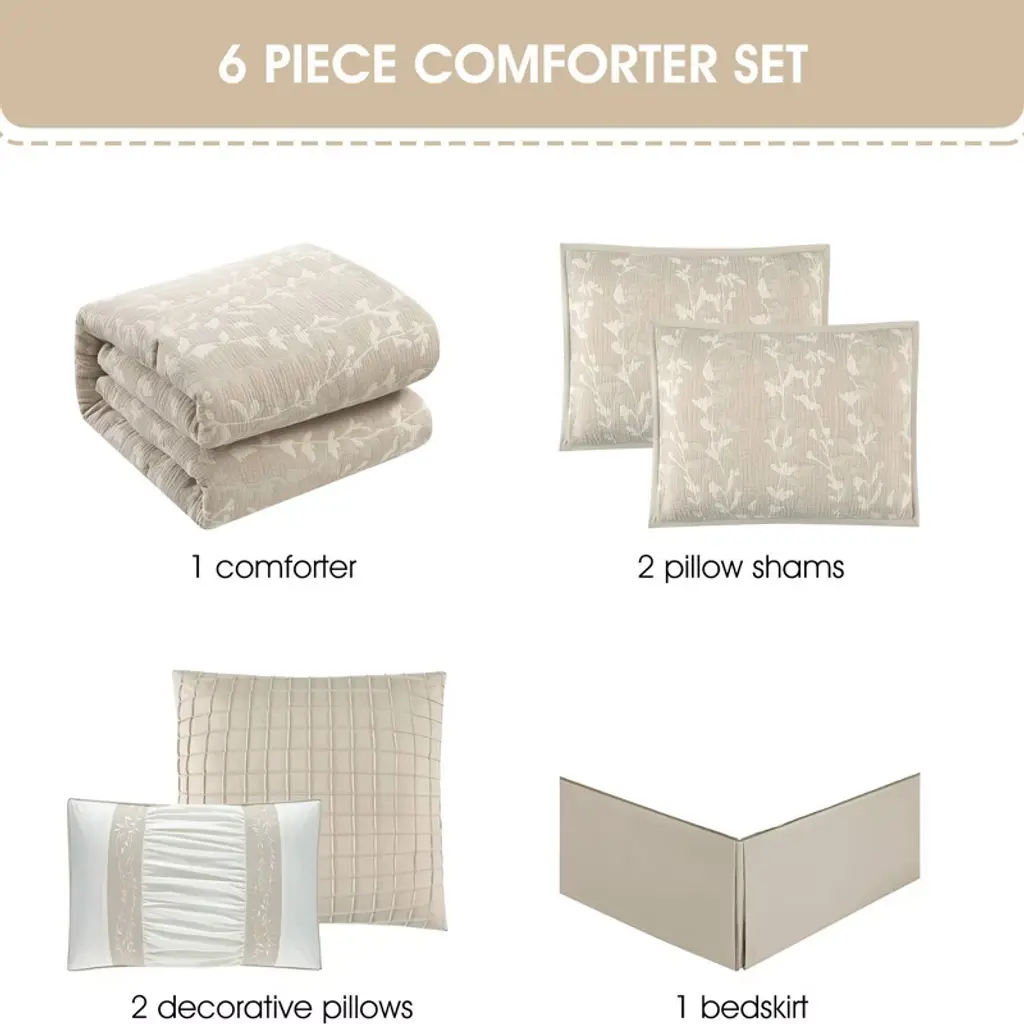 Wrap yourself in the calming embrace of understated luxury with this 6-Piece Comforter Set, thoughtfully designed for the modern home. The soft, 100% cotton fabric offers a breathable, cozy feel that invites you to unwind, while the OEKO-TEX® certification ensures it is free from harmful chemicals, giving you peace of mind and restful sleep. A delicate ivory floral motif is intricately woven into a warm taupe backdrop, creating a layered texture that is visually soothing and irresistibly touchable. The minimalist design lends a clean, airy look, making your bedroom feel lighter and more inviting. Best of all, it's machine washable, so you can enjoy its beauty and comfort without the fuss