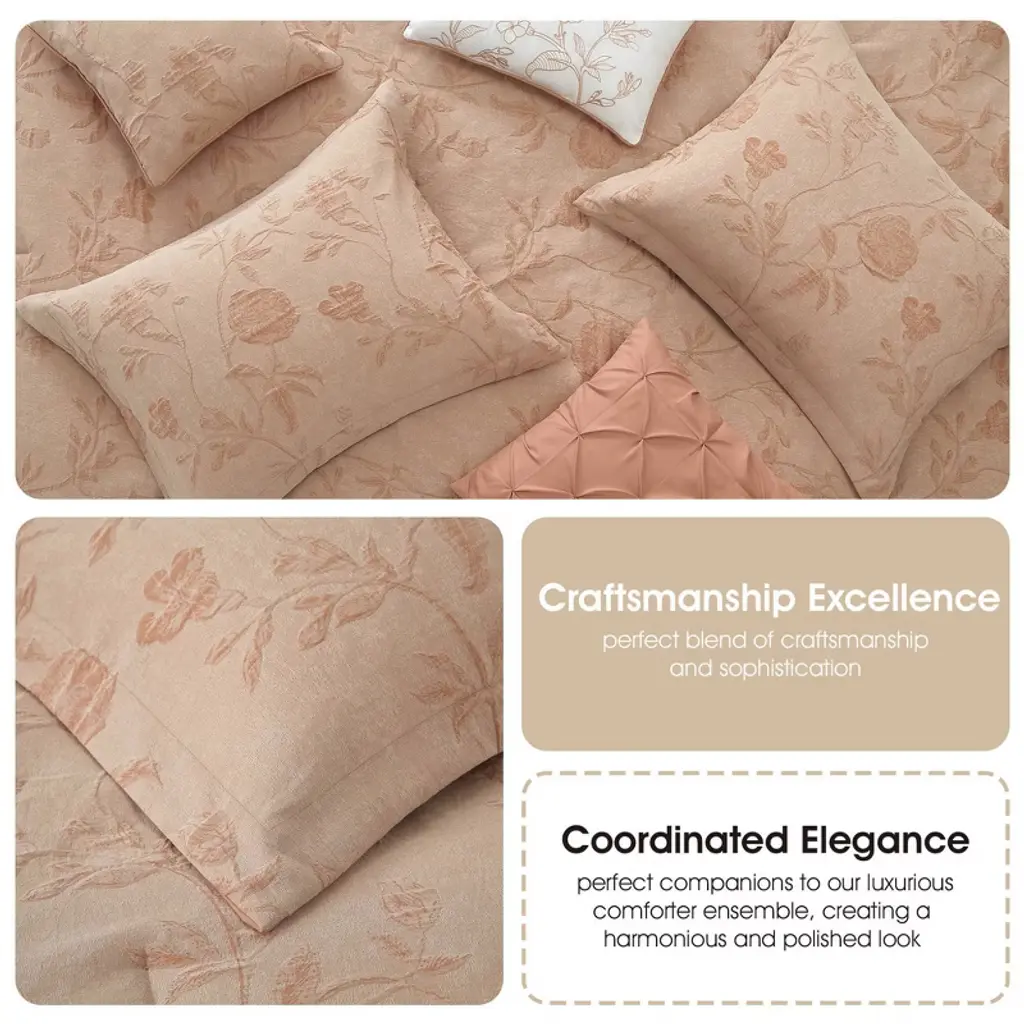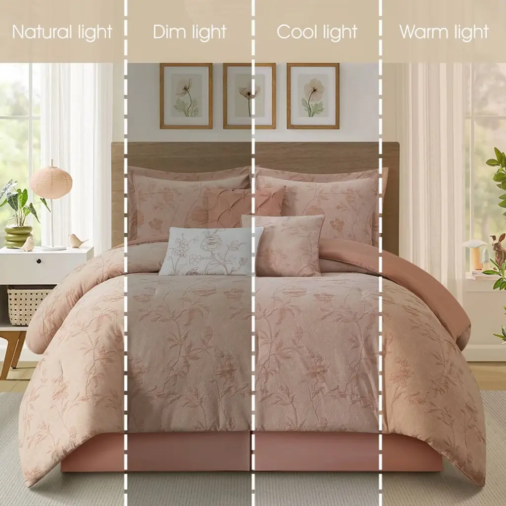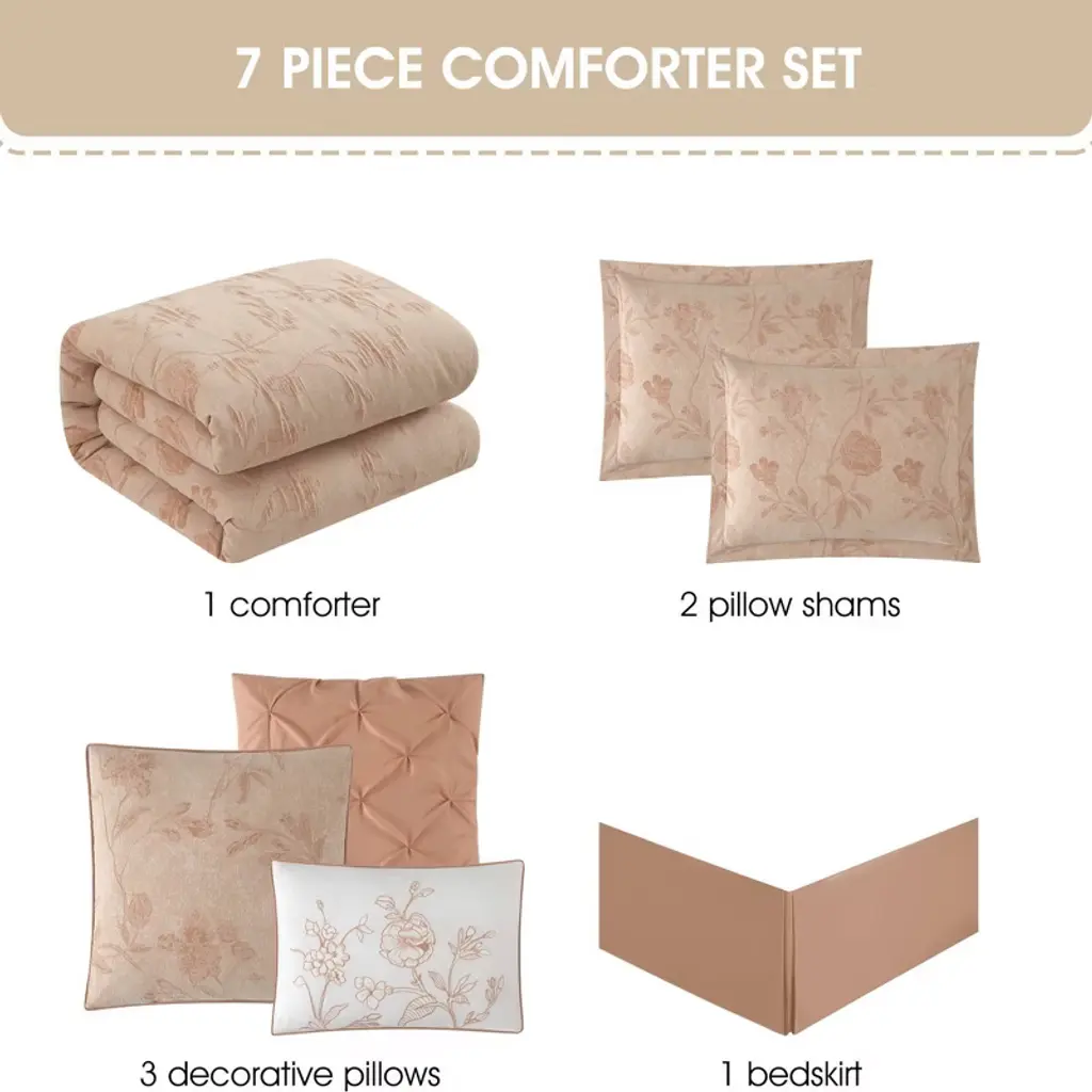 This elegant 7-piece comforter set brings timeless charm and texture to your bedroom with its beautifully woven jacquard floral design. The tone-on-tone pattern offers a refined, romantic touch, while matching solid microfiber accents are crafted with detailed piece work techniques for a sophisticated, layered look. Soft, breathable, and designed for year-round comfort, this set creates a serene and stylish retreat where relaxation comes effortlessly.