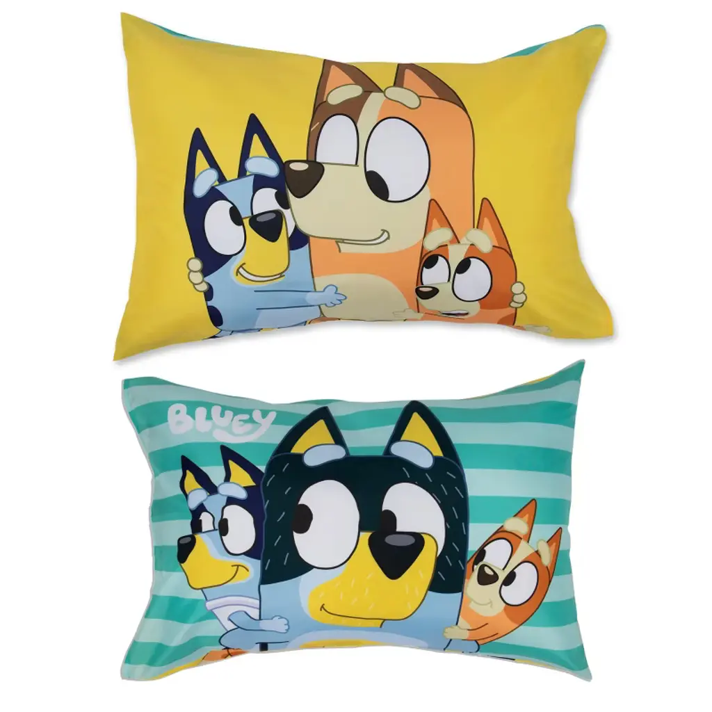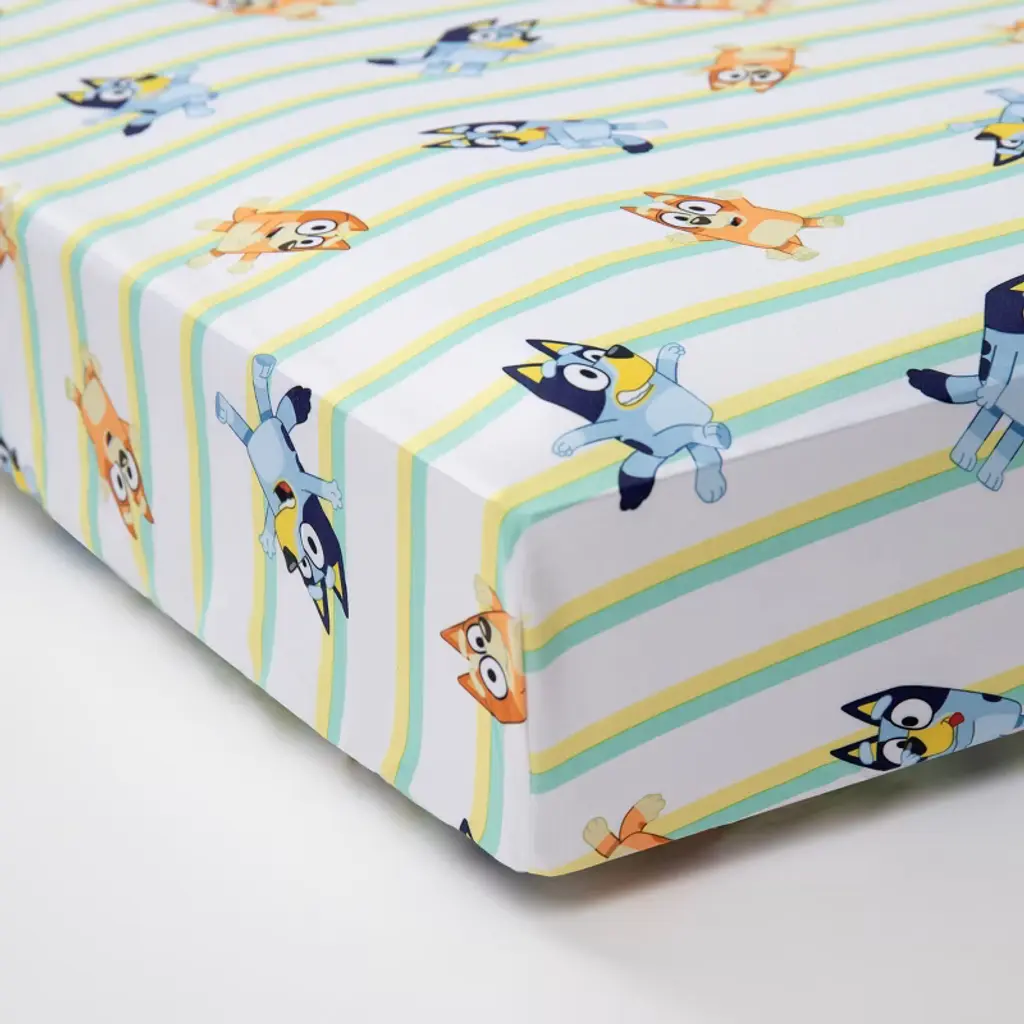 Bluey 4 Piece Toddler Bed Set - Dive into Dreamland with Your Favorite Blue Heeler Family! Make bedtime a playful adventure with the Bluey 4-Piece Toddler Bed Set, specially designed to bring the magic of the hit animated series straight to your child's bedroom. Inspired by the lovable Bluey and her family, this bed set is sure to ignite your little one's imagination and fill their dreams with joy and laughter. This 4-piece toddler bed set includes a reversible comforter, reversible pillowcase, flat sheet, and a fitted sheet that fits a standard crib/toddler mattress. Crafted for comfort, this bedding is made from high quality, super soft 100% Polyester that will ensure your child will have a cozy night’s sleep. This bedding set is machine washable for easy care. Bring the joy, love, and laughter of Bluey to you’re toddler’s room with this Bluey 4 Piece Bed Set.