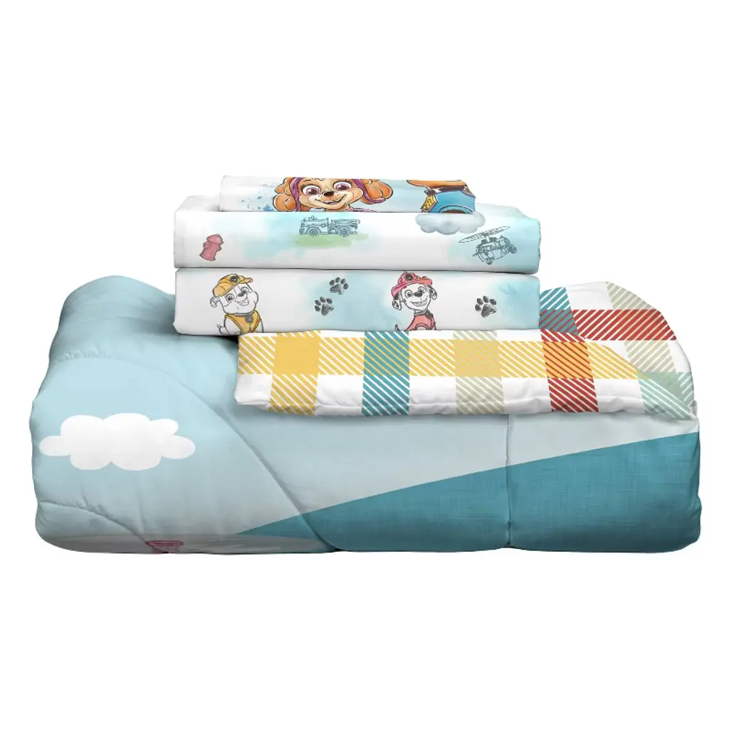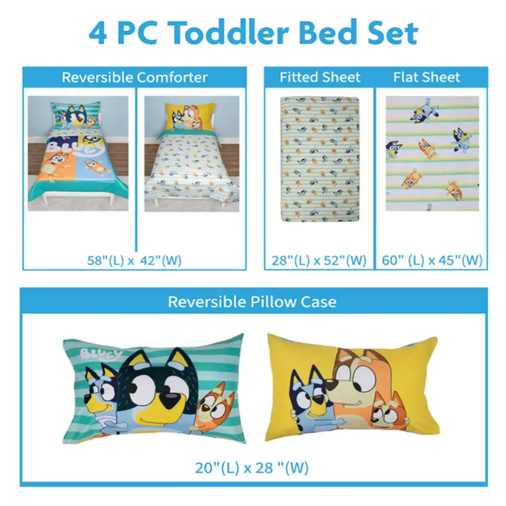 Nojo Bluey 4 Piece Toddler Bed Set - Includes Comforter, Fitted Bottom Sheet, Flat Top Sheet, Reversible Pillowcase