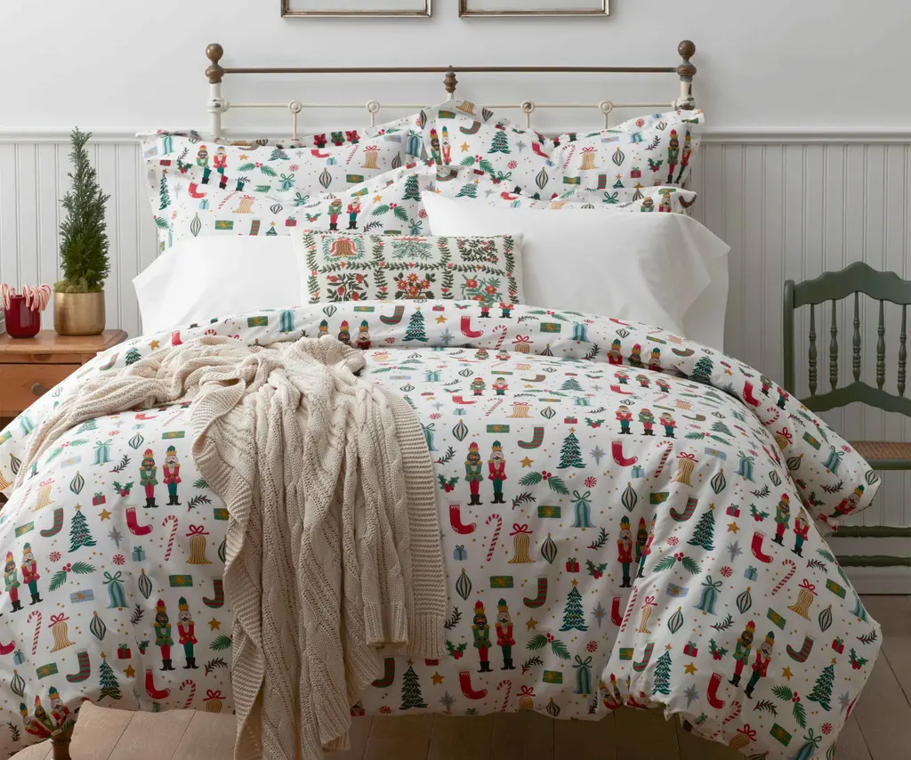 Dreams of sugarplums will dance in your head with our Nutcracker comforter, featuring Nutcrackers, stockings, and sweets galore. This breathable and crisp percale bedding collection is an excellent choice for year-round use. Complete your bed with the coordinating sheets or shams. Part of the Rifle Paper Co. x The Company Store collection.